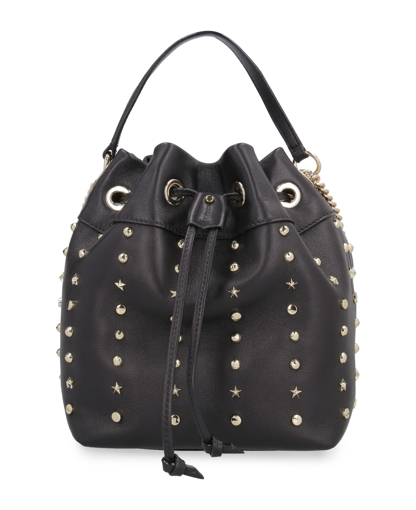 Decorative gold-tone metal studs Leather top handle Drawstring closure Leather and chain shoulder strap One interior pocket Gold-tone metal hardware Canvas lining Width: 17 cm Height: 21 cm Depth: 11 cm Strap: 120 cm 100% Leather