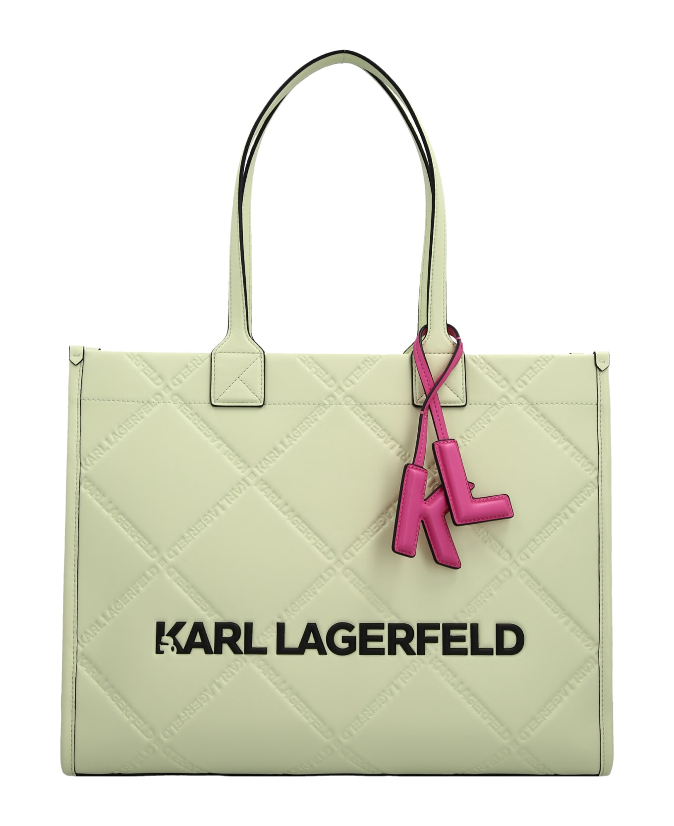 K/Klare' shopping bag in a leather effect fabric with all-over embossed logo, removable charm with KL print, top zip closure, two top handles and a shoulder strap, and an inner zipped pocket.