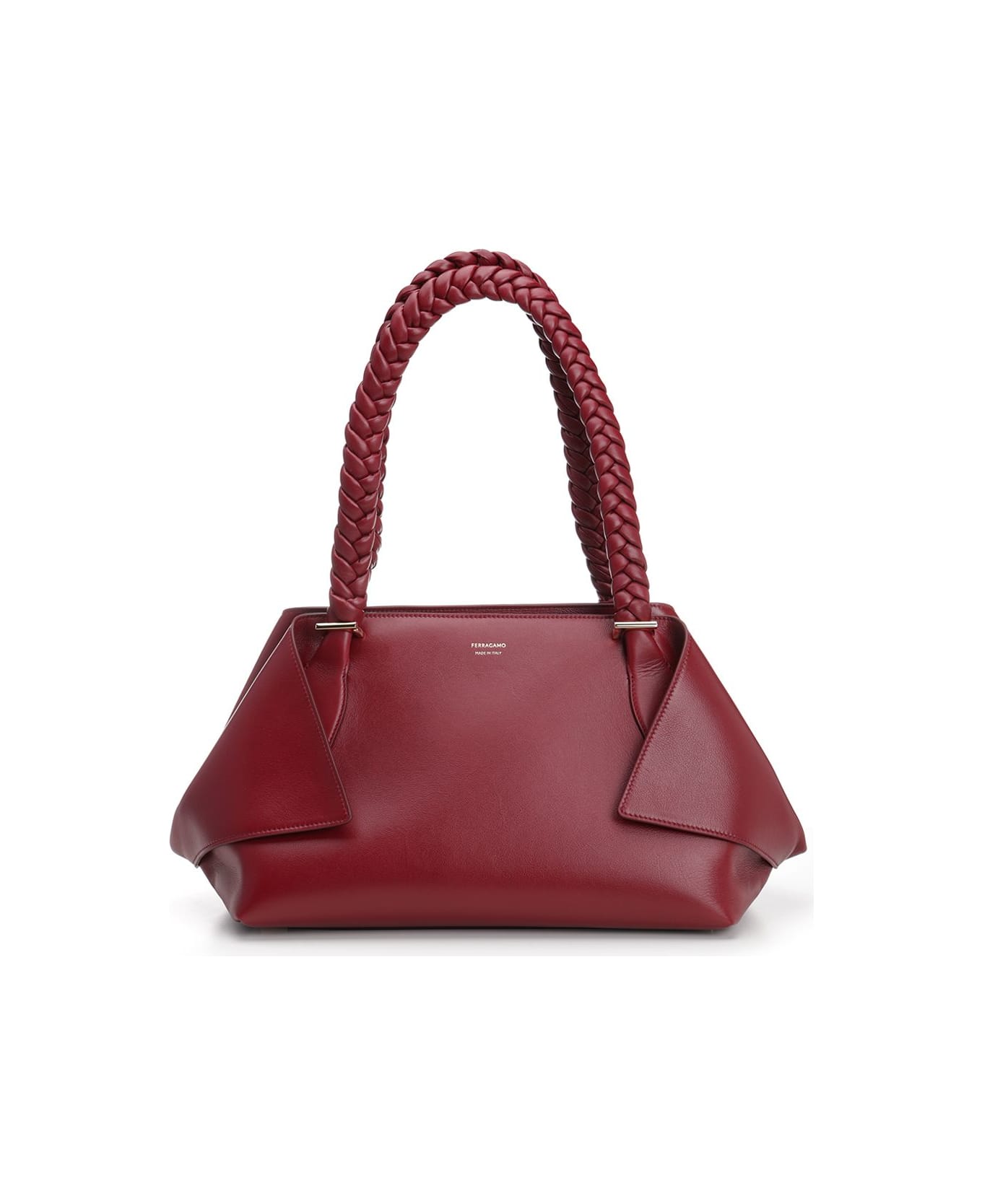 Smooth burgundy calfskin "L" shoulder bag by Ferragamo with fixed padded and woven handles, adjustable and removable shoulder strap, folded corners and double-slider metal zip closure. Composition: 100%CALF 85%FABRIC LINING(90%COTTON10%POLIURETHANE)15%CALF.
