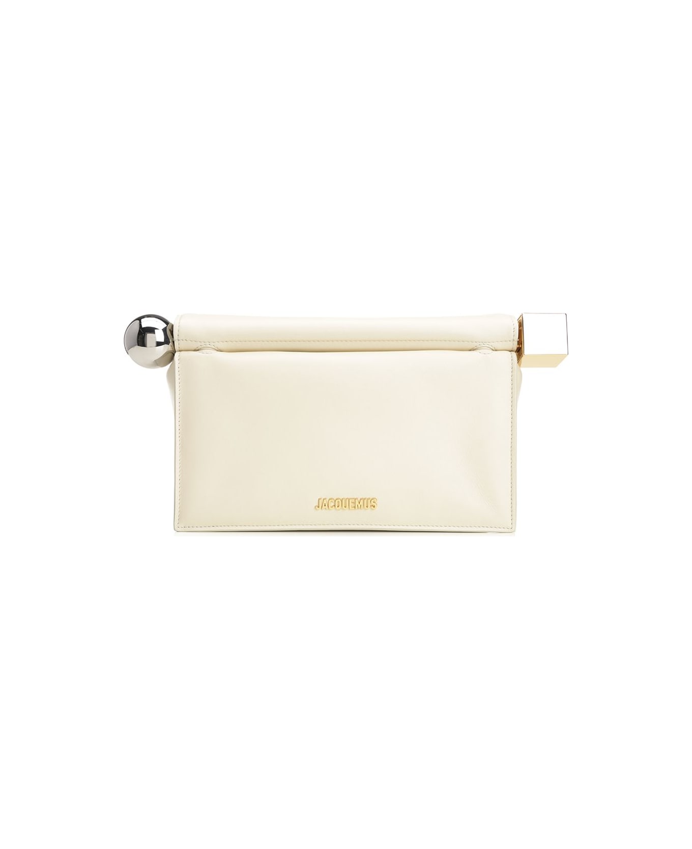 Jacquemus "Rond Carré" folded clutch bag in nappa leather, featuring a large silver-tone metal circle and gold-tone metal square closure, magnetic closure, internal card slots, gold-tone metal trim and logo.