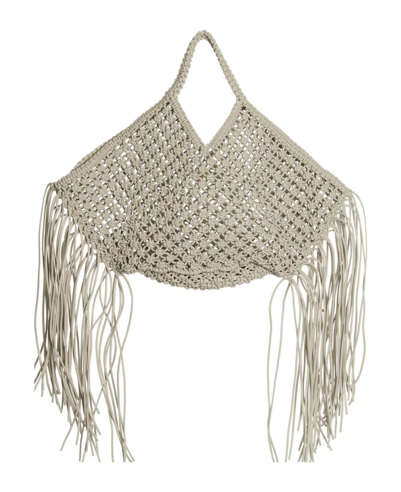 Large woven' shopping bag in braided leather with fringes and a handle.