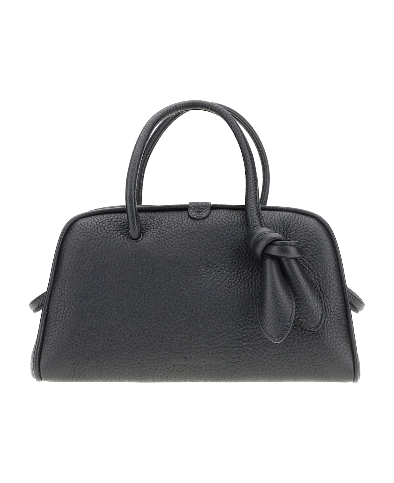 The le petit turismo handbag by jacquemus is made of grained leather, with two upper tubular handles that provide a comfortable grip. it is closed by a top double-slider zipper, making it easy to open and close. an elegant knotted leather bow detail on the handle adds a sophisticated touch. inside, the bag features a single compartment, ideal for organizing personal belongings. a minimalist and chic design, perfect for completing any look with class. removable flat shoulder strap.