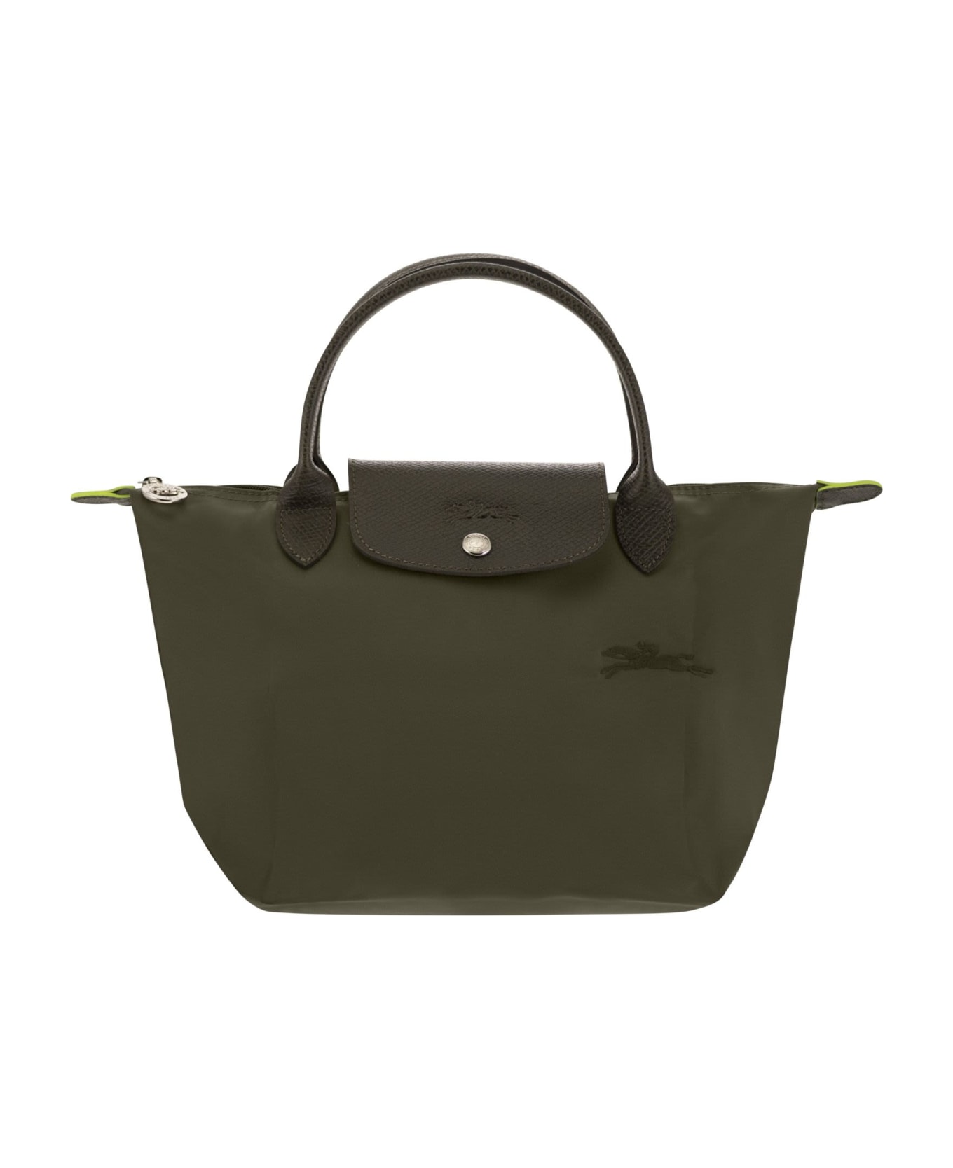 This small hand bag is incredibly lightweight and features classic, feminine clean lines. With its two handles and push-button closure, this bag can be carried by hand and folded into a pocket size in the blink of an eye. Longchamp drew inspiration from the art of origami to create LE PLIAGE, a light, foldable bag that has become a cult object around the world. The Pliage Green line has an ecological style given by the recycled polyamide canvas. It offers a second and nobler life to the materials used. The bag adopts solid codes, such as the embroidered horse, and features tone-on-tone Russian leather trimmings, characteristic of Longchamp. The final detail: a green border on the handle, indicative of the eco-friendly use of materials, recalls the brand's characteristic bright green colour, a symbol of energy, freshness and dynamism! A socially responsible line for an everyday look that fully respects natural resources. DESIGNER ID: 1621 919 479