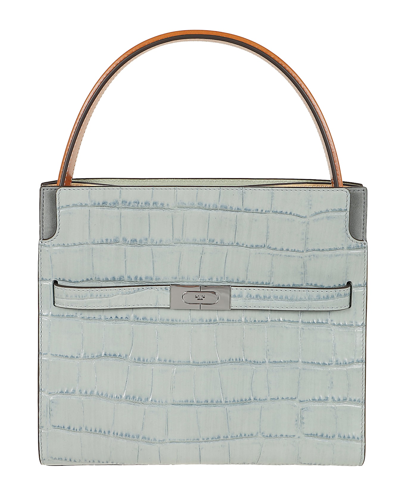 Lee Radziwill Croc Embossed Petite bag in embossed crocodile leather and suede and leather finishing BY TORY BURCH. Herringbone cotton lining, two internal card slots; automatic closing; shoulder strap with snap closure.