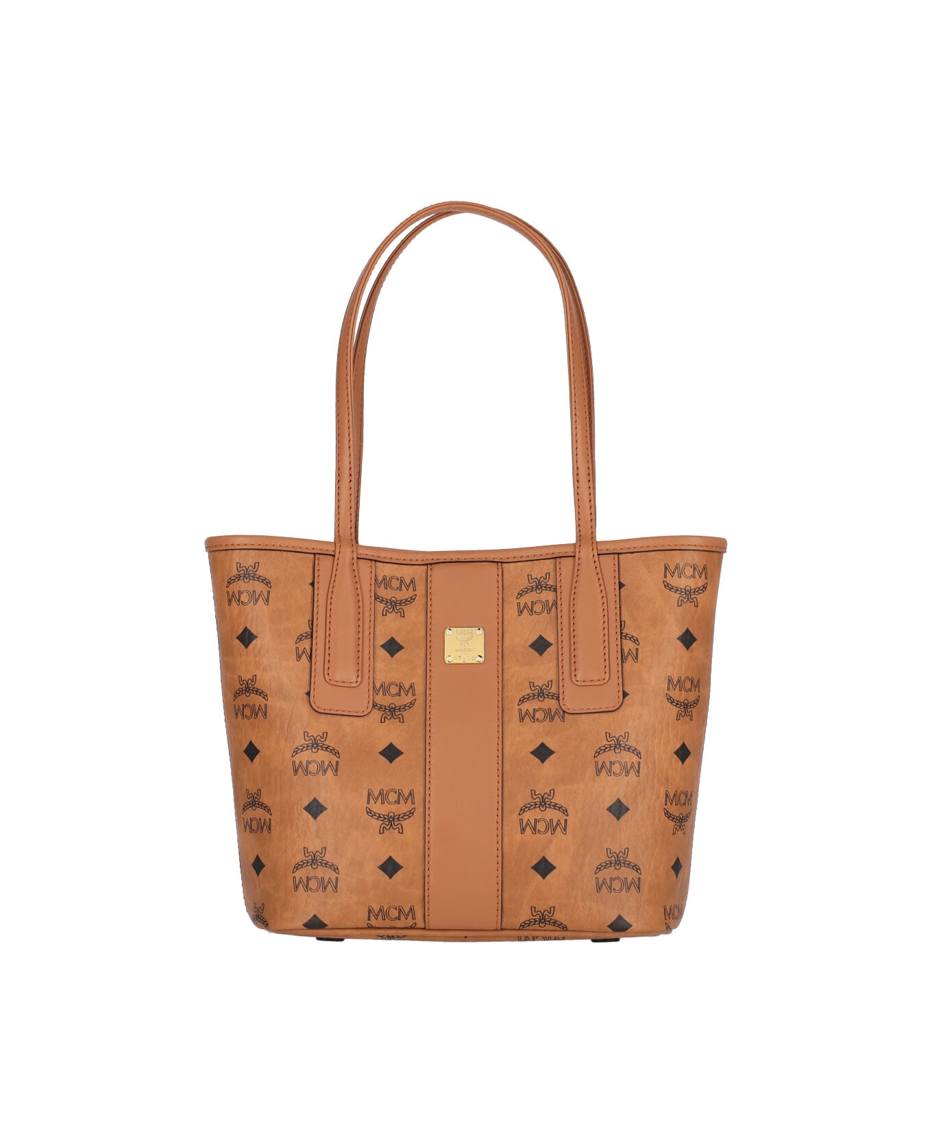 MCM Liz small tote bag in brown Visetos with black logo pattern, nappa trim, two handles, snap button closure, gold metal tag on the front, engraved logo detail, removable inner zip pouch, main inner compartment, metal feet on the bottom.