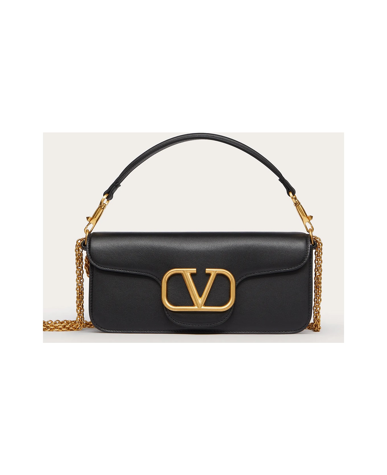 Locò shoulder bag in black calfskin with gold-tone VLogo Signature. It features detachable top handle, gold-tone sliding and detachable chain strap, magnetic closure and one interior flat pocket. Dimensions: 13x27x6cm