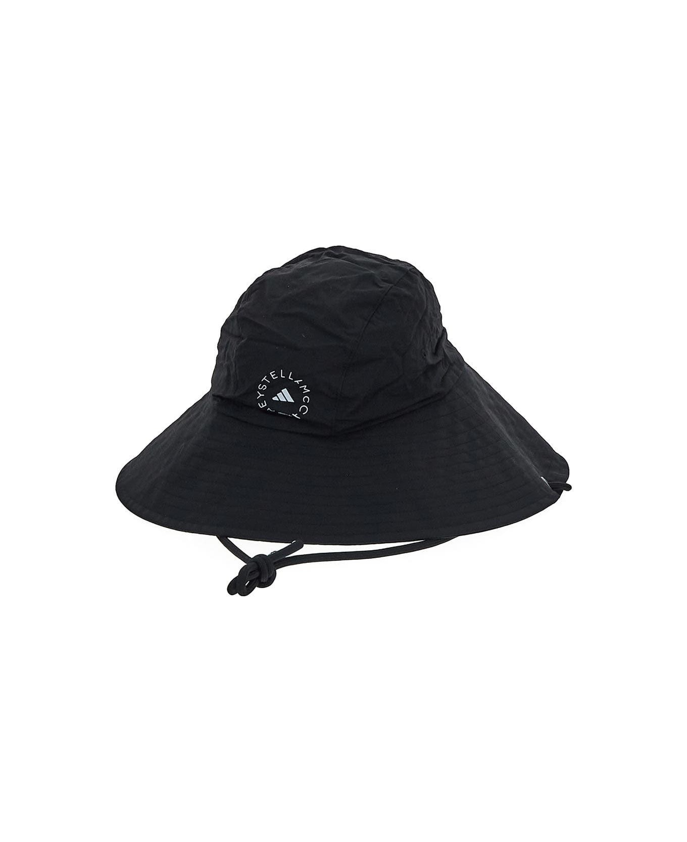 Adidas By Stella McCartney bucket hat in black recycled polyamide with white logo print, adjustable head strap and white logo printed on internal visor.