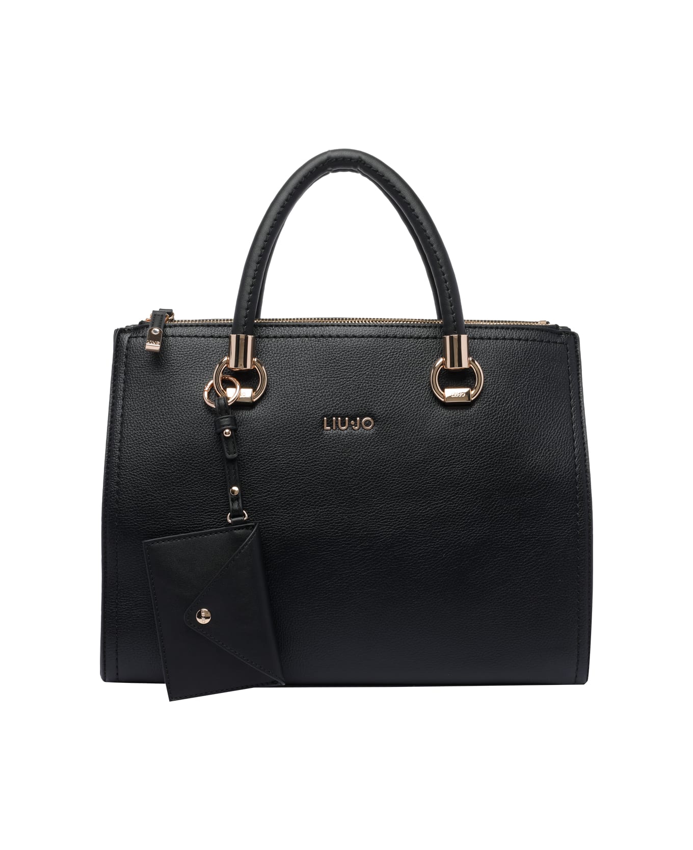 Liu Jo black handbag, frontal logo, three compartments, two zipped and one with magnetic closure, inner zip pocket and one open, two handle, adjustable and removable strap, with detachable pouch