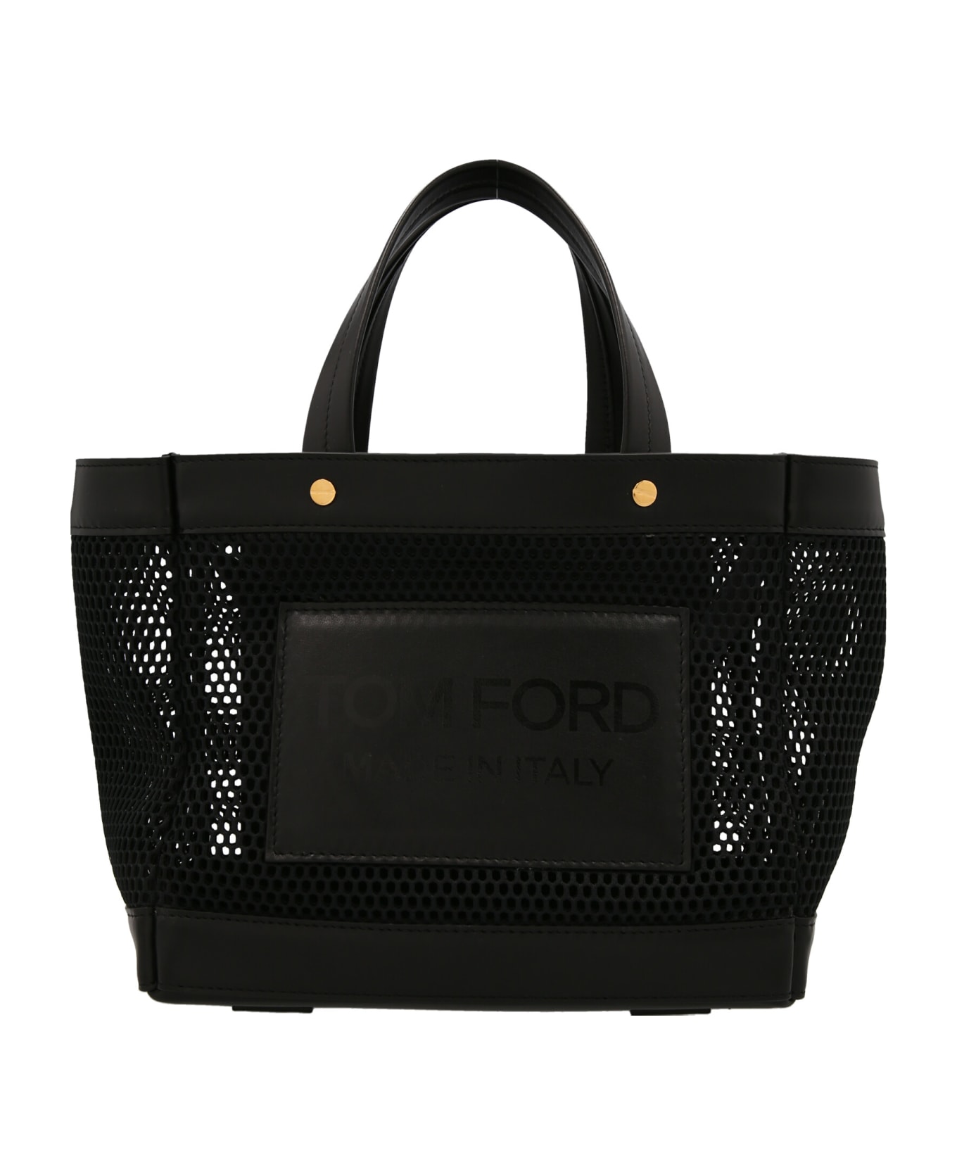 Mesh and leather shopping bag with front leather logo patch, double handle, long tape handle.