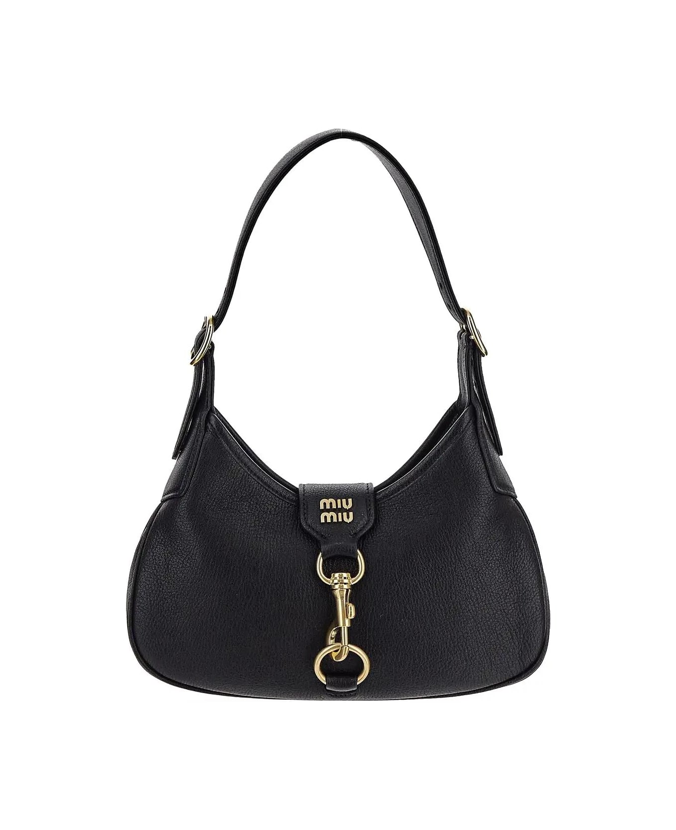 Miu Miu shoulder bag in black grained leather with adjustable and detachable shoulder strap, flap strap with front antique golden finish metal logo plaque and snap hook closure, a main compartment, an inner zip pocket, an open pocket and antique gold-toned metal hardware.