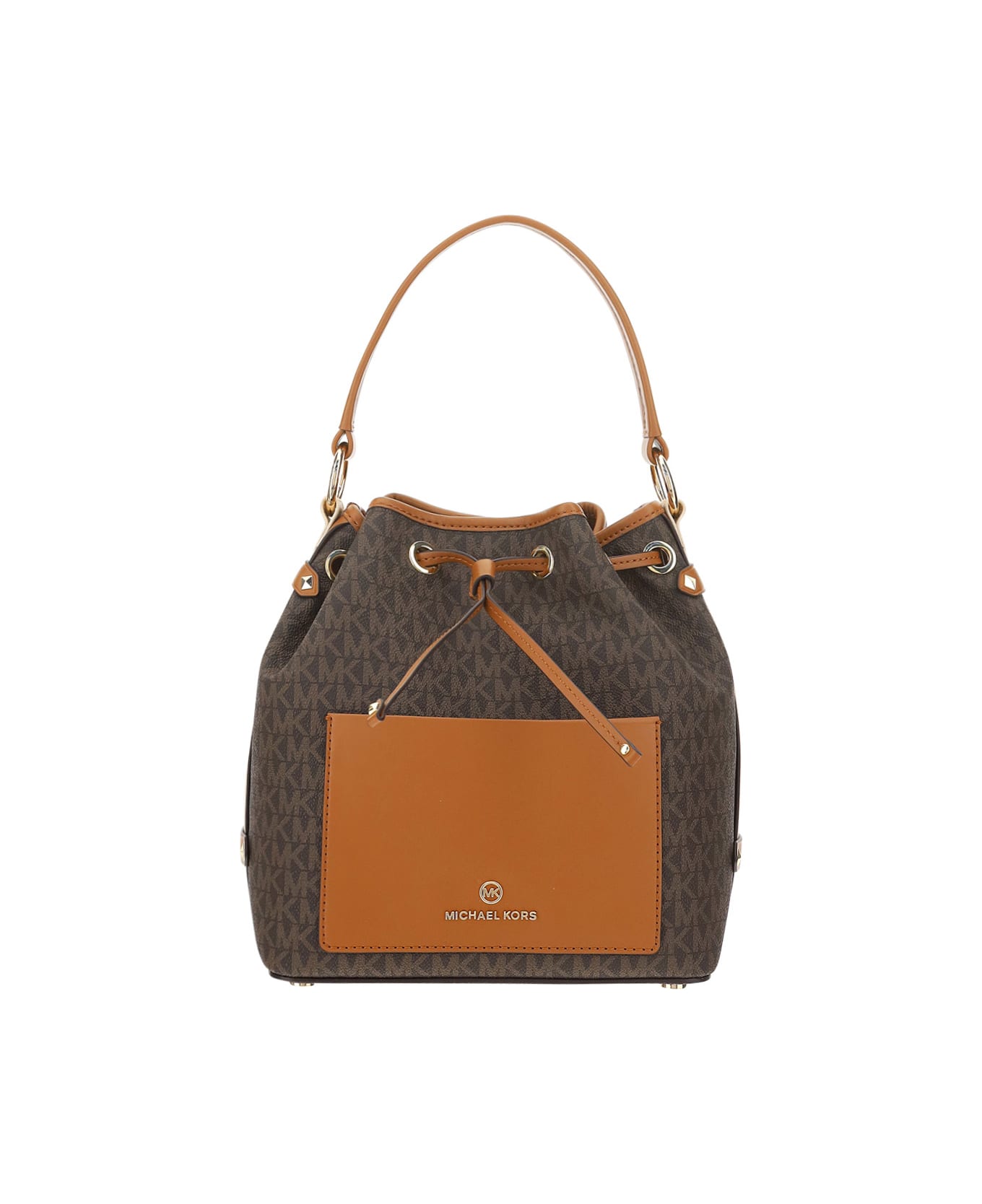 Maeve bucket bag by michael kors, iconic all-over brand pattern, interior magnetic button closure, top drawstring closure, front welt pocket, interior welt pocket with zipper closure, short handle, removable and adjustable shoulder strap.