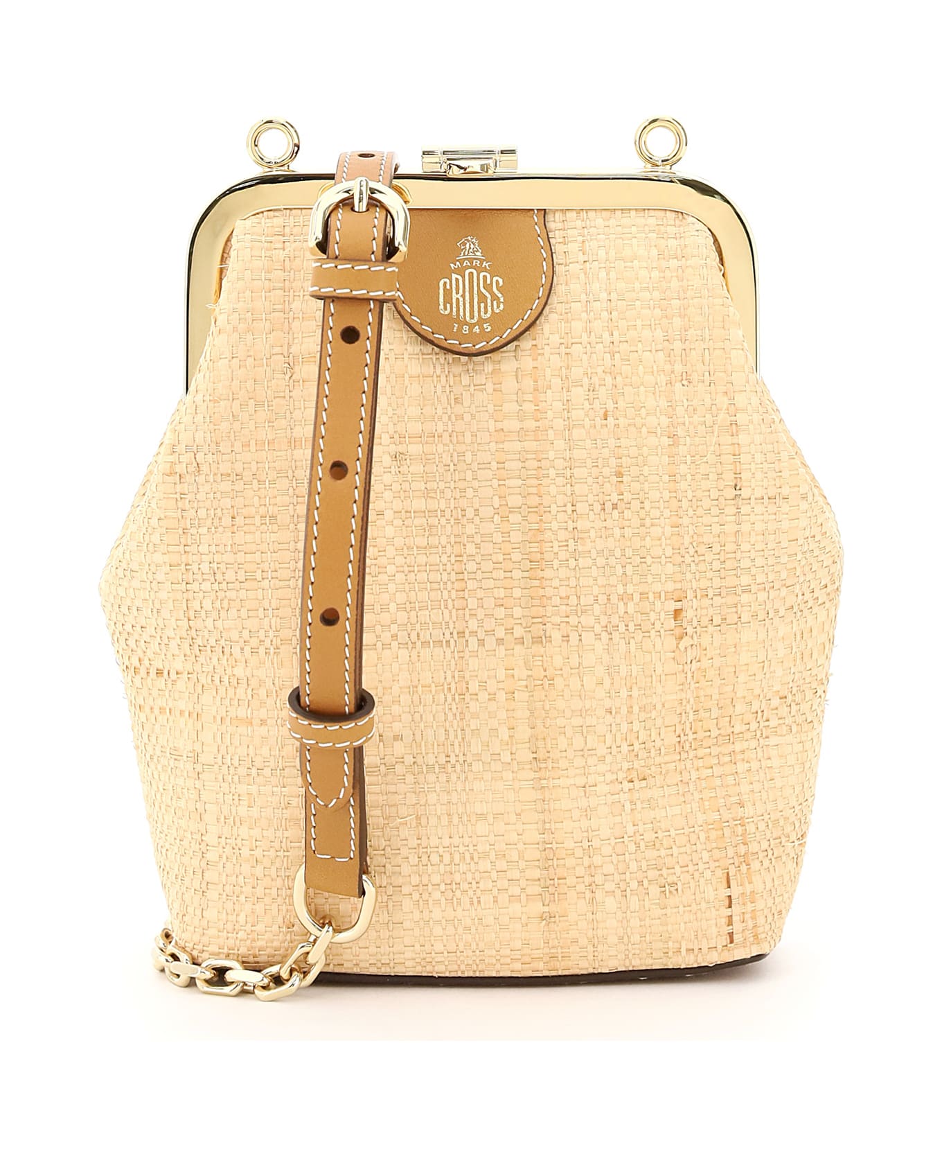 Susanna pouch bag by Mark Cross in woven raffia featuring a metal hinged frame with branded clip closure. Removable and adjustable chain and leather shoulder strap, leather tag with gold-tone logo print on the front, and leather base. Contrasting twill-lined interior with a flat pocket, gold-tone metal hardware.