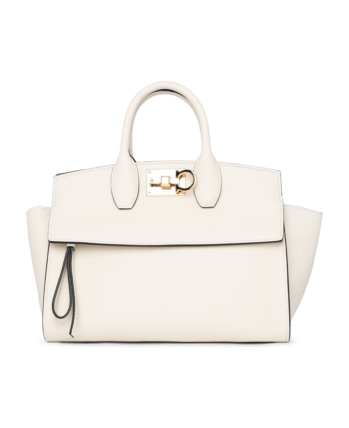Gancini slider closure, front zipper pocket, adjustable and removable tape shoulder strap, inside removable pocket \n29 x 25 x 14 cm Composition: 90% Calf leather, 10% Nylon