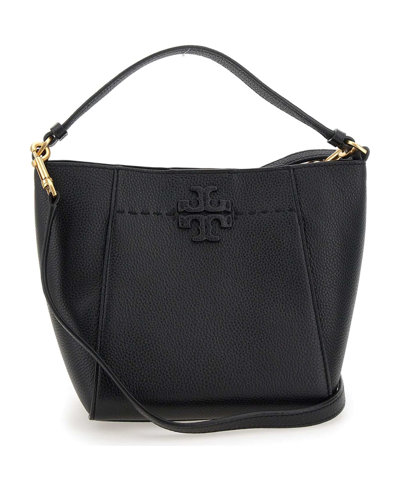 Tory Burch ''McGraw Bucket Handbag " textured leather, half-round handle, adjustable and removable shoulder strap, snap button fastening, inner sachet pockets, iconic double T logo embossed on front, gold metal finishes. Dimensions: length 25cm, height 19cm, depth 12cm. .