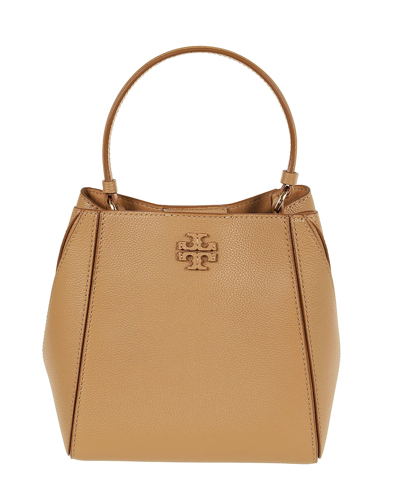 McGraw bucket bag made of grained leather BY TORY BURCH. Microfiber lining with suede-like finish; two internal slot pockets; magnetic closure The bag can be worn two ways: with the top handle or with the shoulder strap.