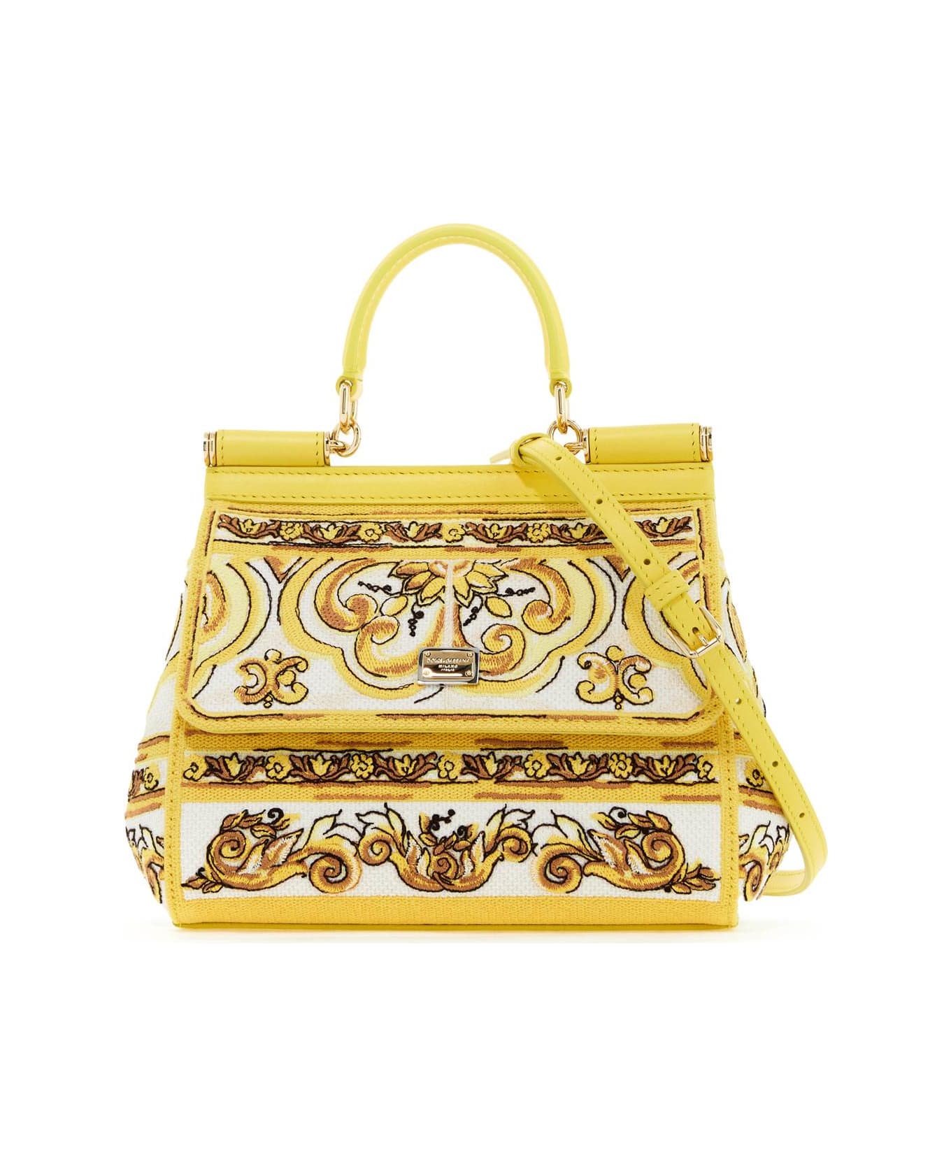 The medium Sicily handbag by Dolce & Gabbana is made of cotton and embellished with embroidered Maiolica pattern, inspired by the ancient ceramics of Caltagirone. It features leather details, a magnetic front flap closure, finished with a branded metal plate, fabric interior with a credit card slot, single handle and adjustable additional shoulder strap. The accessories are in gold-finished metal.