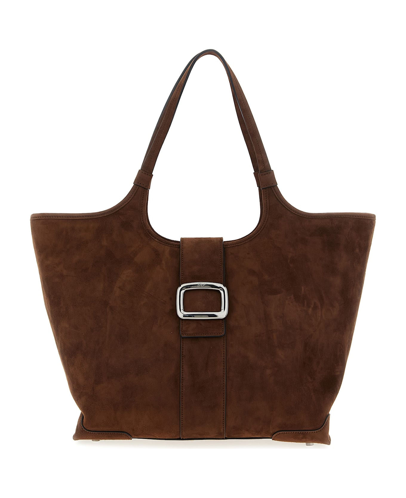 'Viv' Choc' midi suede shopping bag, magnetic flap closure with metal logo buckle, double fixed handle, adjustable width with inner strap.