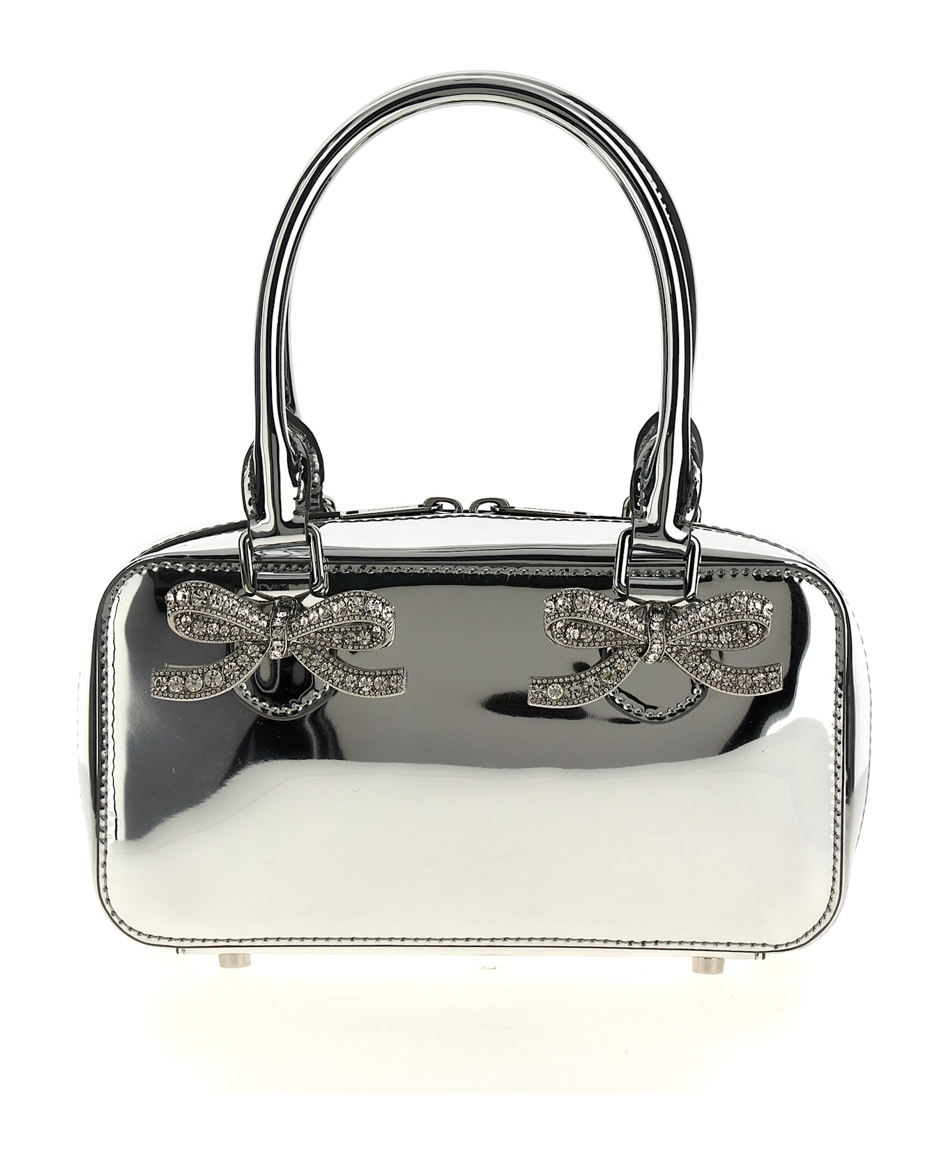'Metallic Silver Leather Mini Tote' shiny leather handbag with metal bow details with front rhinestones, double fixed handle, zip closure, pocket.