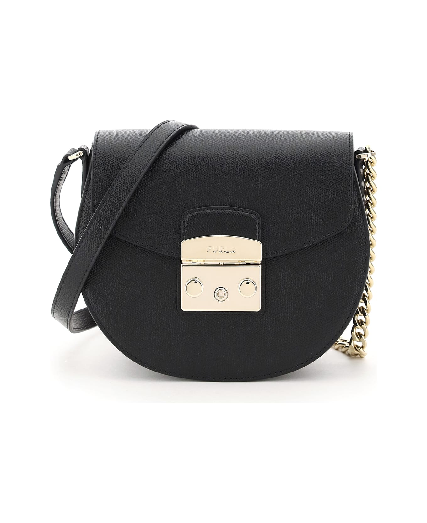 Metropolis crossbody mini bag by Furla, crafted in embossed leather with a round structure. Flap with branded metal snap closure, adjustable leather strap with chain insert, fabric lined interior with an open flat pocket. Gold-finished metalware.