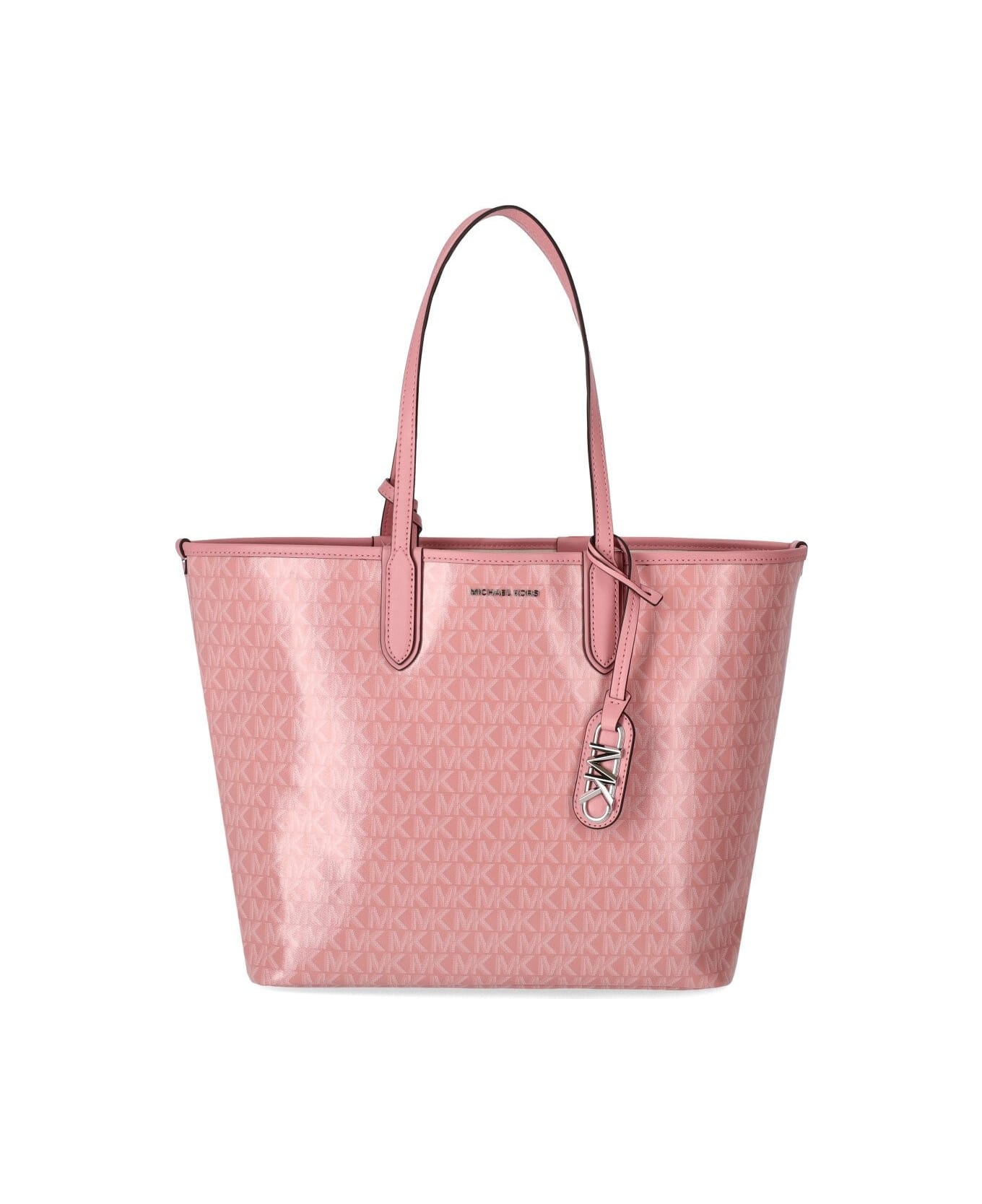 Eliza shopping bag by Michael Kors made of pink faux leather with a shiny finish, decorated with a contrasting monogram motif. Fabric lined interior, equipped with detachable pouch, silver-tone metal details and removable logo charm on the front. Measures 31x41x13 cm.