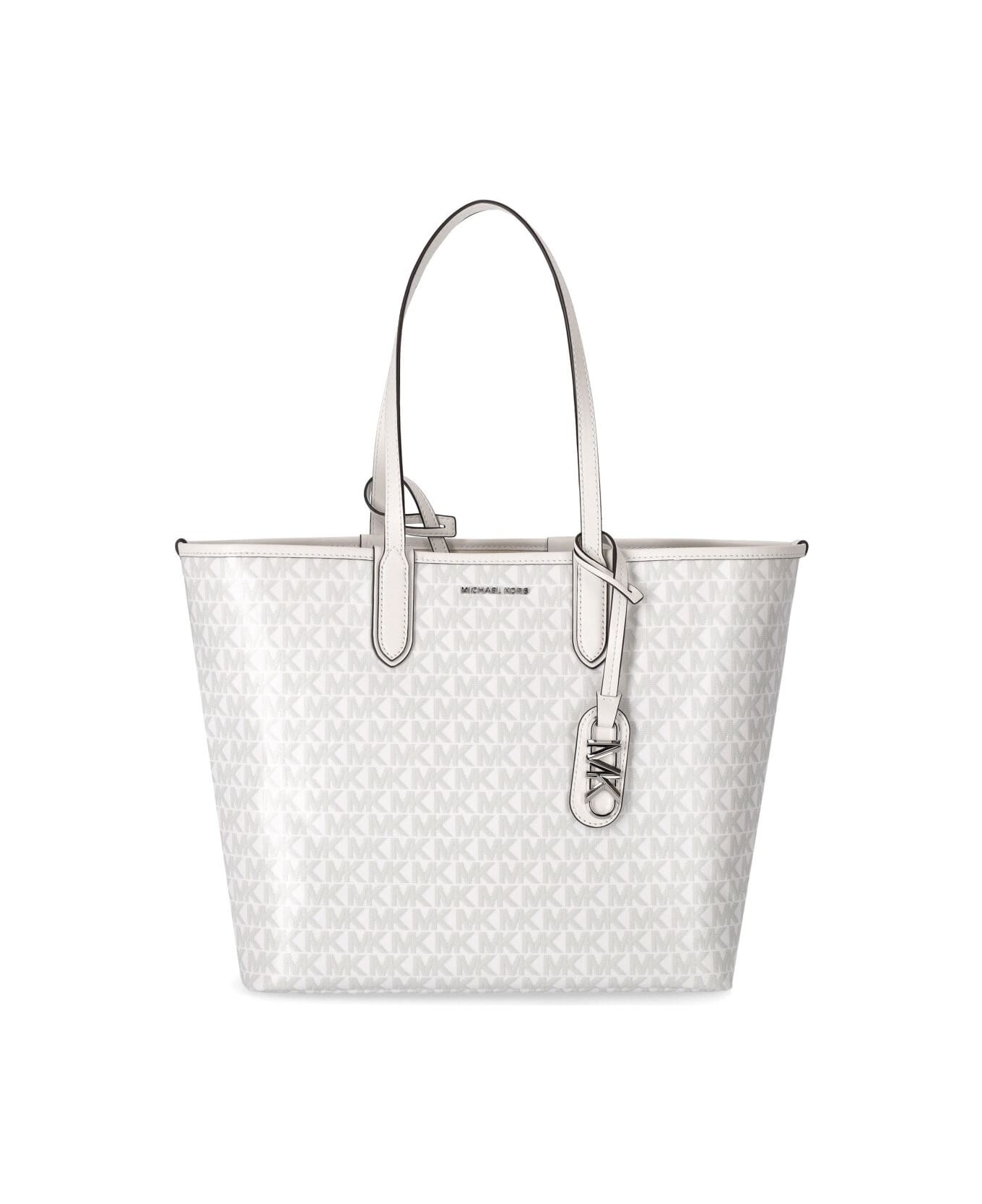 Eliza shopping bag by Michael Kors made of white faux leather, with glossy finish and MK monogram motif. Fabric lined interior, equipped with detachable pouch, silver-tone metal details and removable logo charm on the front. Measures 31x41x13 cm.