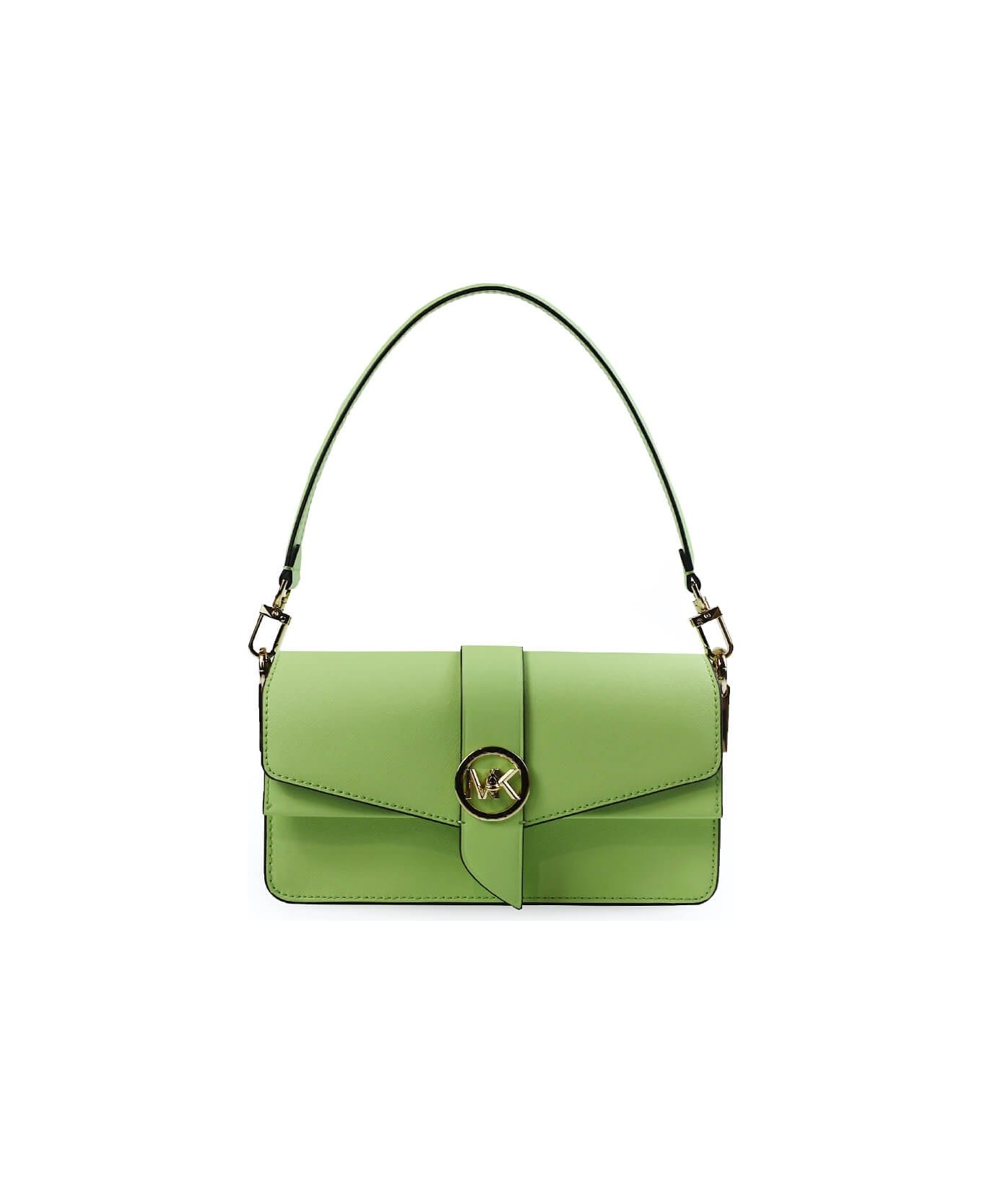 Greenwich shoulder bag by Michael Kors made of light green saffiano leather, featuring an interior divided into two compartments plus a partition with zip, golden metal details and iconic MK logo on the front that completes the twist closure. Interchangeable leather handle and shoulder strap. Measures 25x13. 5x6. 5 cm.