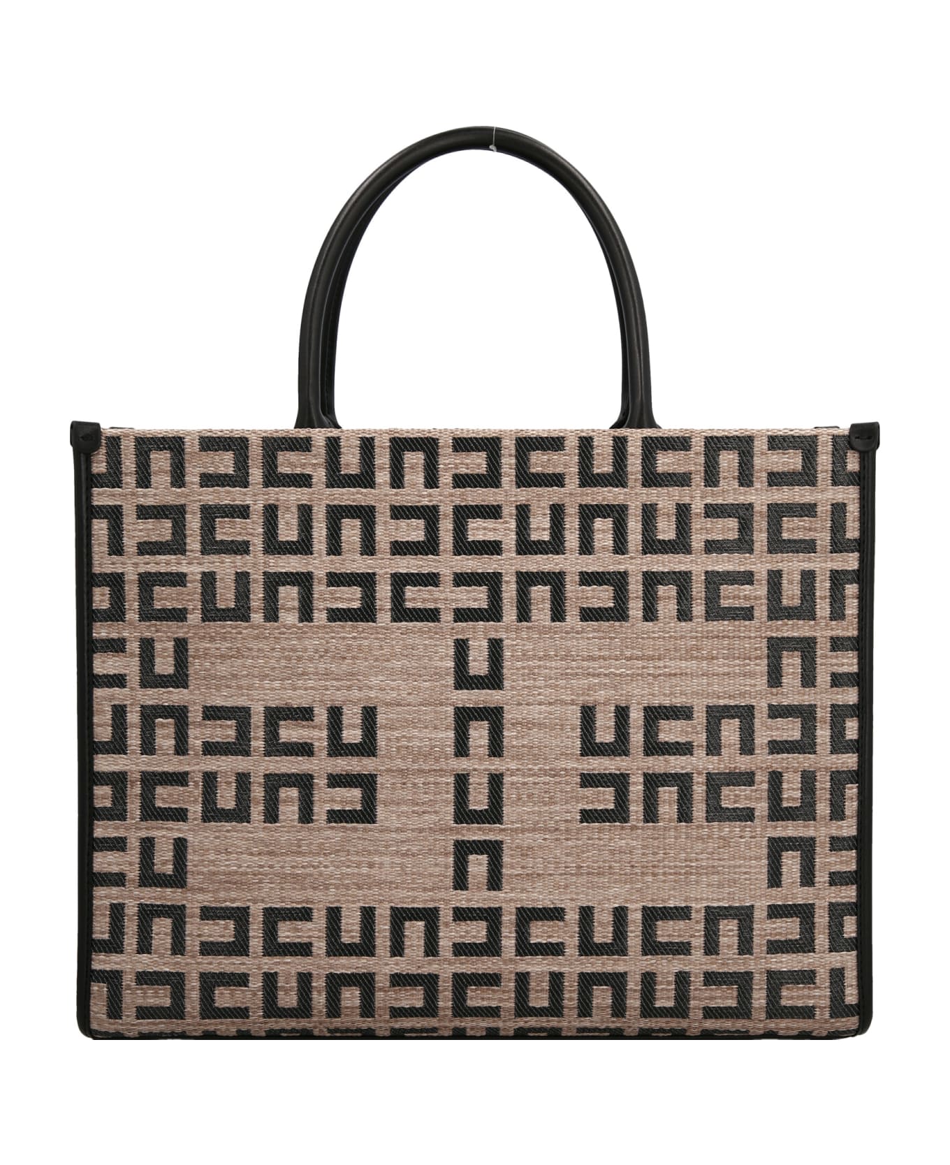 Midi raffia shopping bag with black contrast labyrinth print pattern and a front logo, profiles, abrasive leather material handle and shoulder strap, tubular handle, a removable shoulder strap and an inner pocket.
