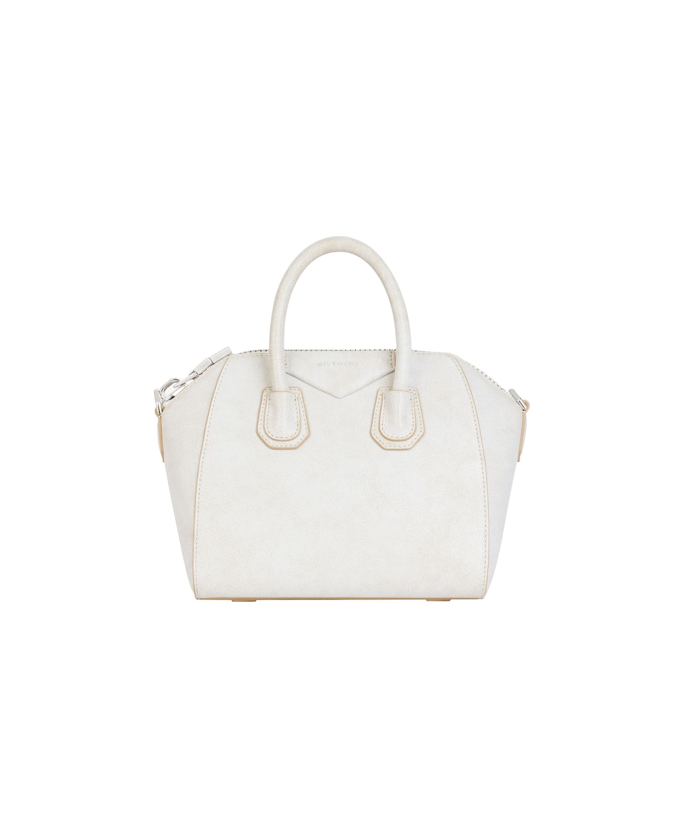 Mini Antigona bag by GIVENCHY crafted from lightly tumbled, hand-aged ivory calf leather. It features two top handles, a main compartment, an internal zipped pocket, an adjustable and removable leather shoulder strap, a GIVENCHY 4G zip and zip pull fastening and a silver embossed GIVENCHY signature pentagonal applique. Shoulder strap length: 48 cm. Handle height: 8 cm.