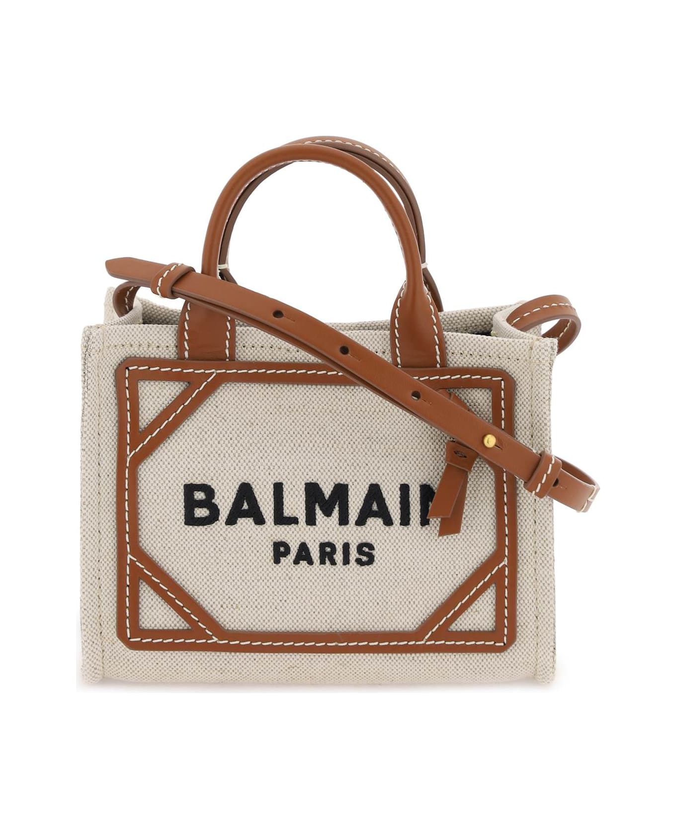 B-Army mini crossbody bag by Balmain crafted in cotton and linen canvas with leather inserts, contrasting stitching and embroidered lettering logo at front. Snap-button closure, leather inside patch pocket, leather double top handle and adjustable shoulder strap.