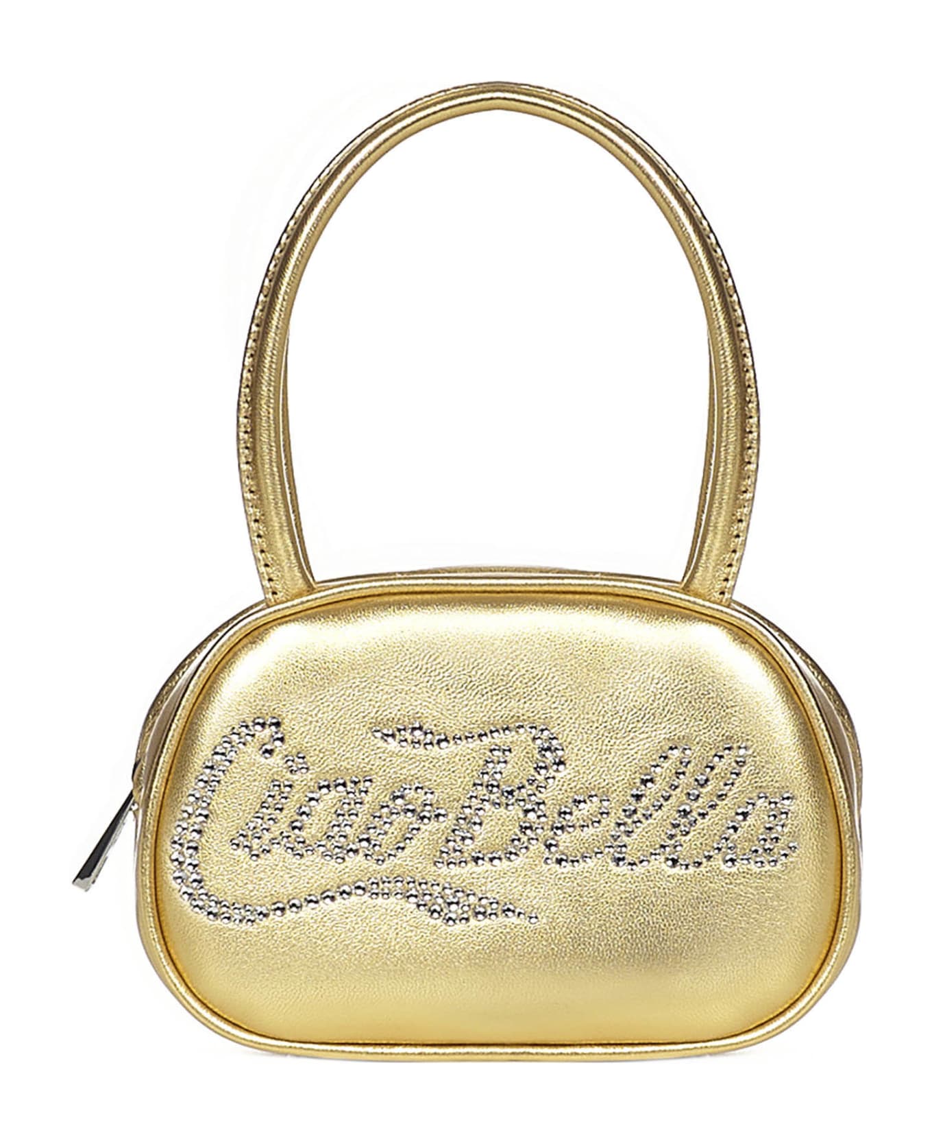 New IT-bag from Amina Muaddi' precious hands, the Mini Bella in gold metallic nappa is the most glamorous and shimmering accessory of the season. Double handle and zip closure trace the lines of the mignon design, illuminated by the crystals on the front that form the text Ciao Bella.