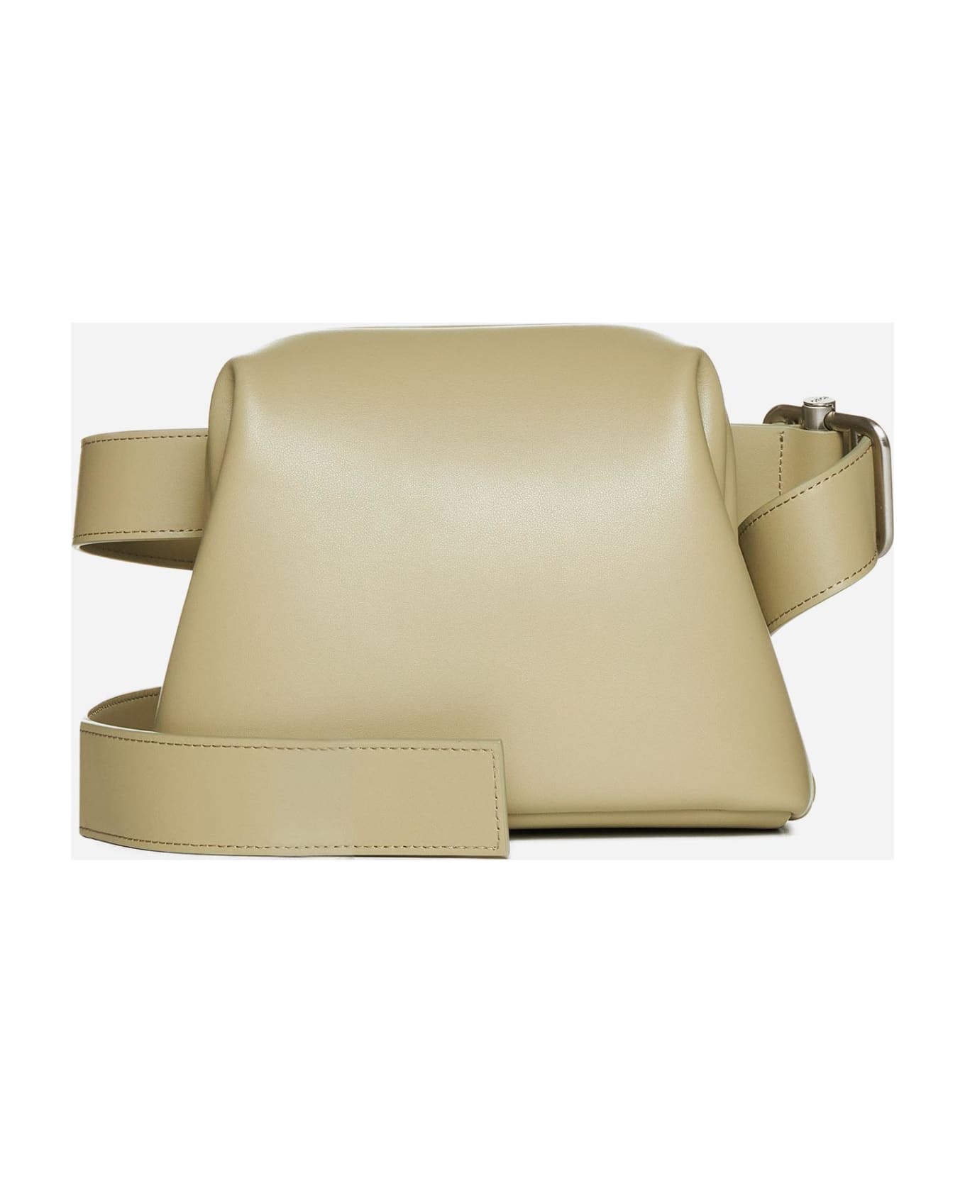 Osoi's Mini Brot sage green leather bag featuring a trapeze silhouette, rigid clutch-style fastening, adjustable shoulder strap, logo printed on the back, internal flat pocket and silver-tone metal hardware.
