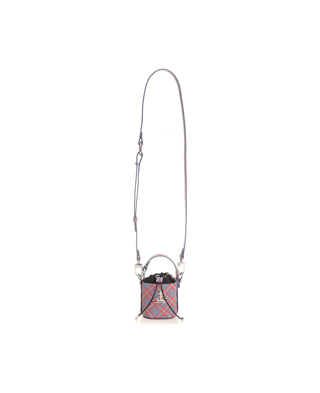 "Saffiano McHarris tartan" mini "Daisy" bucket bag by Vivienne Westwood. Handle and removable shoulder strap. Drawstring closure. Silver metal Orb logo on the front. Composition: 65% Polyurethane 35% Cotton