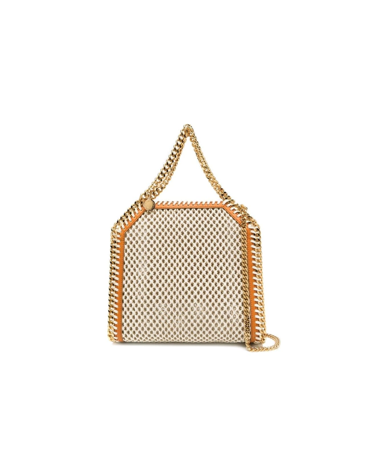Ivory and beige Falabella mini tote bag by Stella McCartney crafted from recycled cotton-blend canvas with a mesh weave and featuring a nylon tulle layer, 3 gold-tone diamond-cut chains and contrasting Alter Mat (a vegan alternative to animal skin). The bag features a logo pendant, a single internal compartment, an internal pouch pocket and a press stud closure. Model can be worn in two ways: folded over the shoulder or as a hand bag. Product made without the use of leather, in accordance with the brand's cruelty-free ethics.