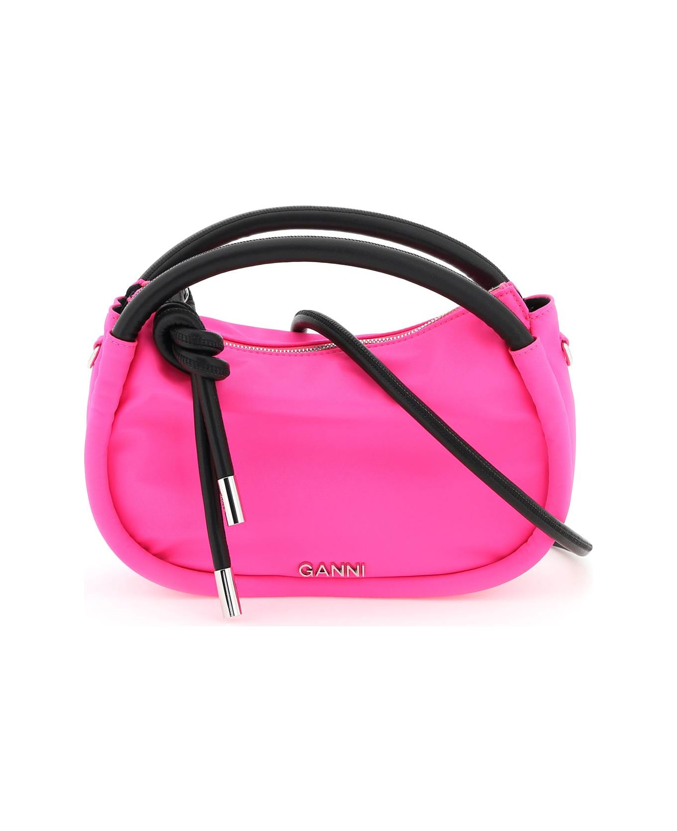 Ganni bag crafted in recycled nylon and characterized by the tubular leather handles which cover the full edges. Metal lettering logo on front, zip closure characterized by the knotted leather zip puller, detachable tubular shoulder strap in leather. Cotton lining and one inner open flat pocket. Silver-finished metalware.
