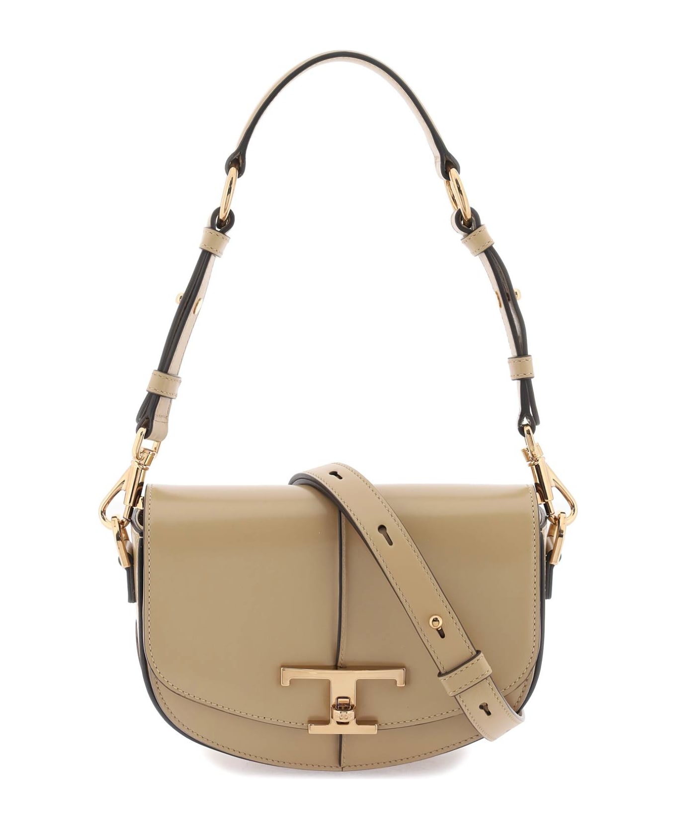 Tod's shoulder bag made of semi-gloss leather with central ribbing and T Timeless turn lock buckle closure. It features gusseted pocket under flap, microfiber suede interior with one open pocket, flat pocket at back. The bag can be carried on the shoulder or crossbody, thanks to the interchangeable handle and shoulder strap. Gold-finished metalware.