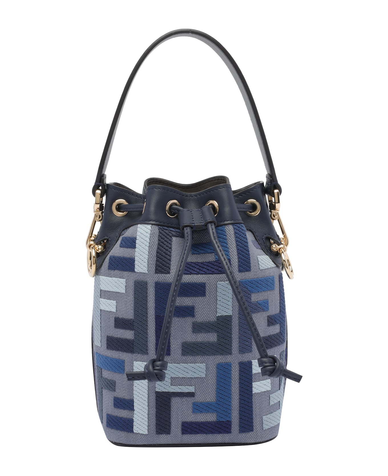 Fendi blue Mini Mon Tresor denim bucket bag, coulisse closure, removable strap, adaptable and removable strap, denim FF logo allover Composition: 100% Fabric, Leather Trim