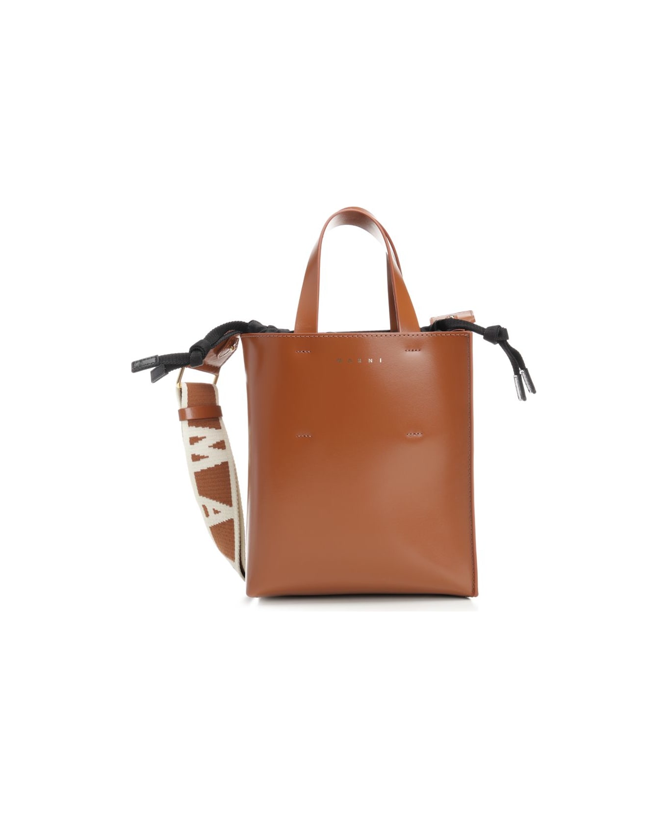 "Museo" mini bag in brown leather by Marni with handles and adjustable-removable recycled ribbon shoulder strap with writing. Fabric interior with drawstring and slot pocket. Gold-colored printed logo on the outside. Composition: Body: 100% Calf Leather - Inside: 100% Calf Leather - Contrast: 100% Polyester - Lining: 55% Cotton 45% Polyurethane - Lining: 100% Cotton - Metallic