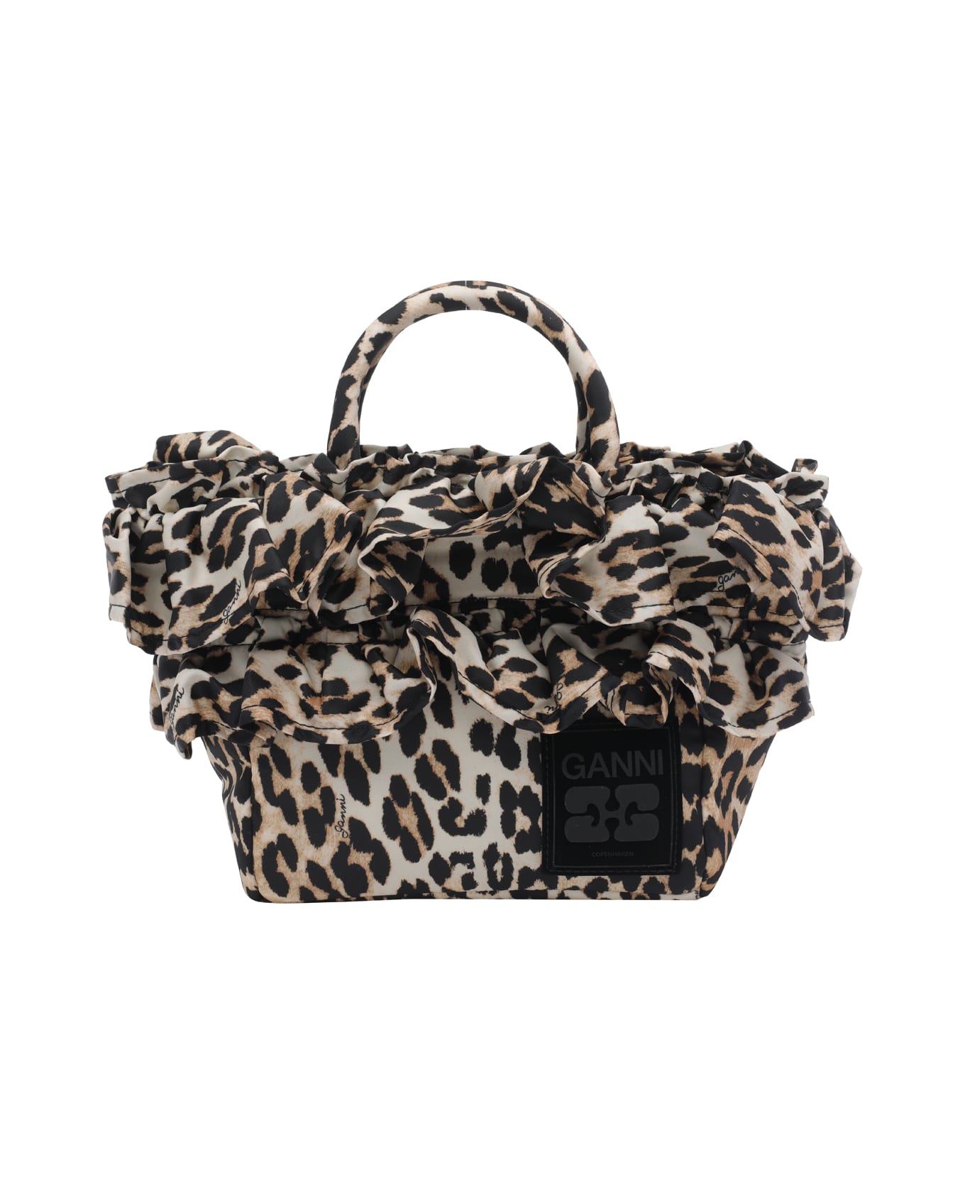Ganni leopard handbag, magnetic closure, inner zip pocket and one open pocket, 2 handles, adjustable and removable shoulder strap, patch logo on the front, rouches details Composition: 93% Polyamide, 7% Polyurethane
