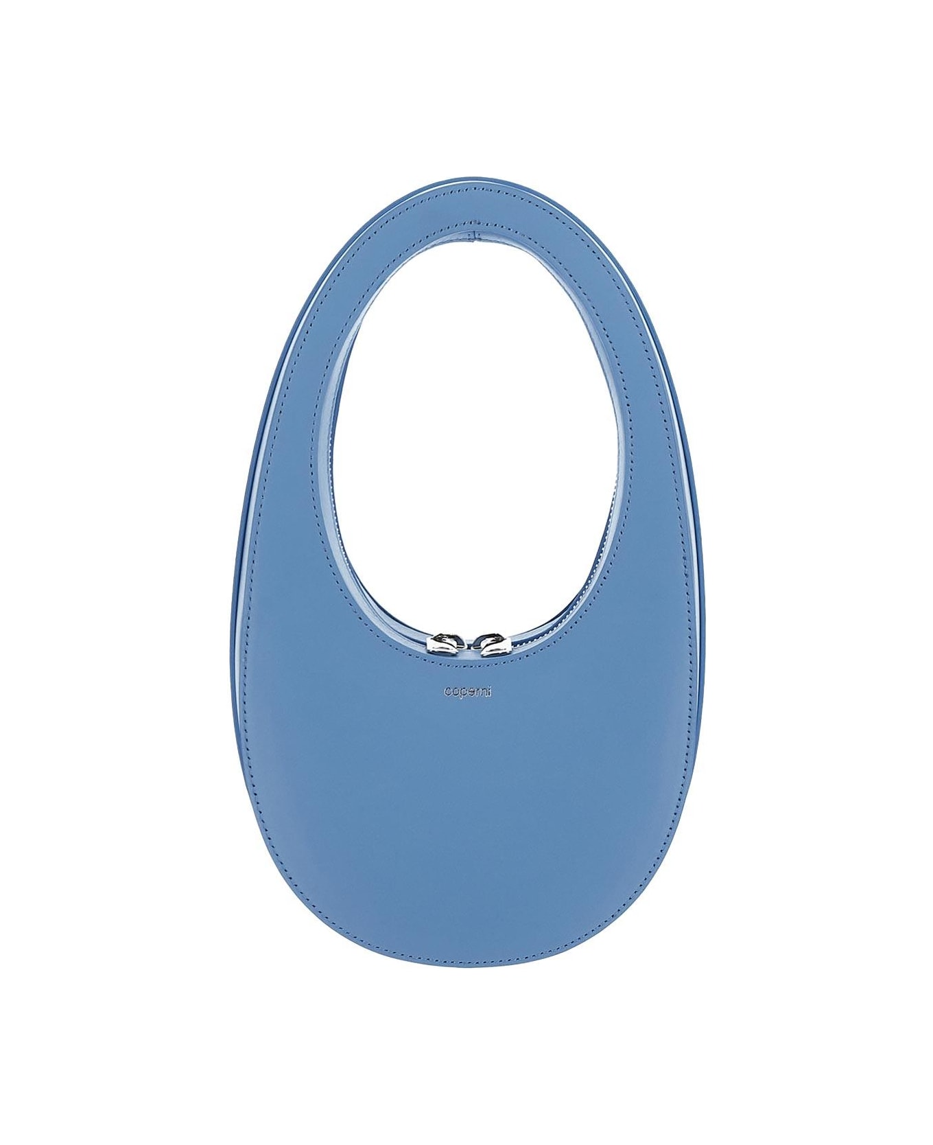Coperni mini swipe bag in smooth light blue calf leather featuring oval shaped, reinforced top handle, one compartment with double-ended zip in silver tone with engraved tips, debossed logo at front and logo patch at side.