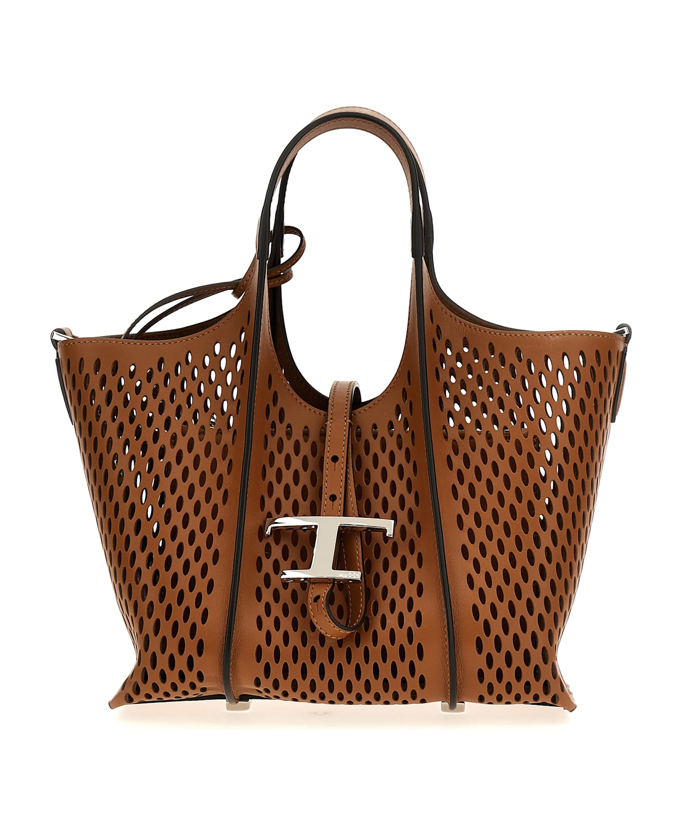 Mini shopping bag in perforated leather, custom metal 'T Timeless' pendant accessory, double handle, strap and snap button closure, removable leather pouch, adjustable and removable shoulder strap.