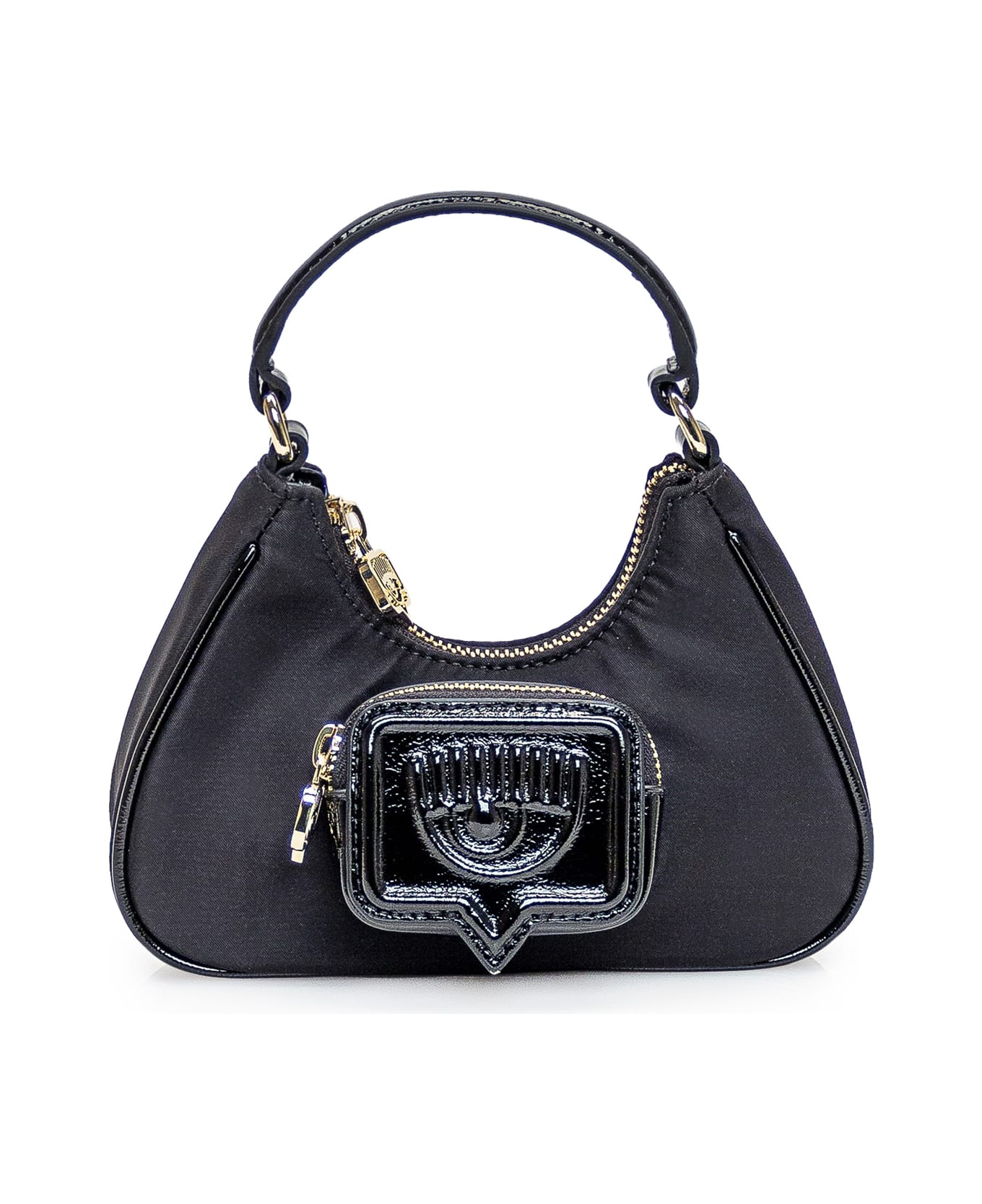 Black handbag. One handle. Removable shoulder strap with chain. Two compartments with zip. Embossed logo on the front. Composition: Outside:, 100% Polyester Lining:, 100% Polyester