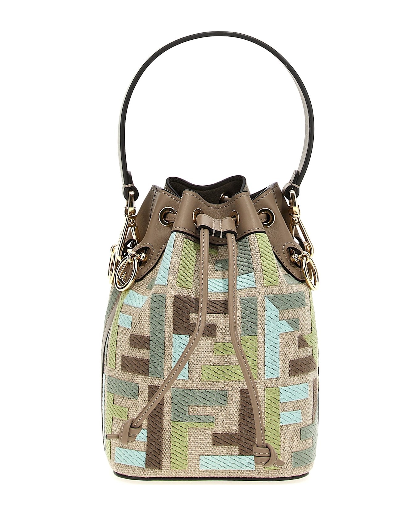 Linen-blend canvas fabric 'Mon Tresor' mini bucket bag with iconic embroidered FF pattern embossed with multicolor thread, metallic and leather details, drawstring closure, removable leather handle, removable leather shoulder strap.