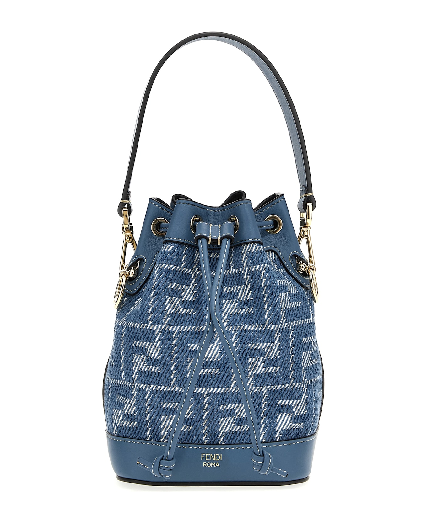'Mon Tresor' mini handbag in FF jacquard with denim effect, metal and leather details, drawstring closure, removable handle, removable shoulder strap. Composition: 97% cotton 3% polyester