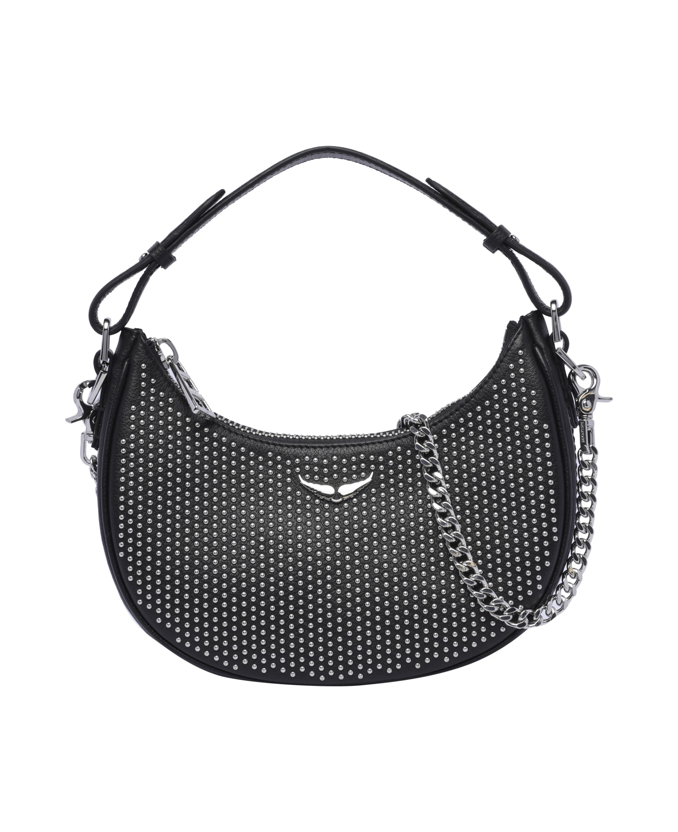 Zadig&Voltaire black Moonrock Plumeties hobo, zip closure, removable shoulder strap, removable chain strap, removable and adaptable strap, frontal silver logo Composition: 100% Calf Leather