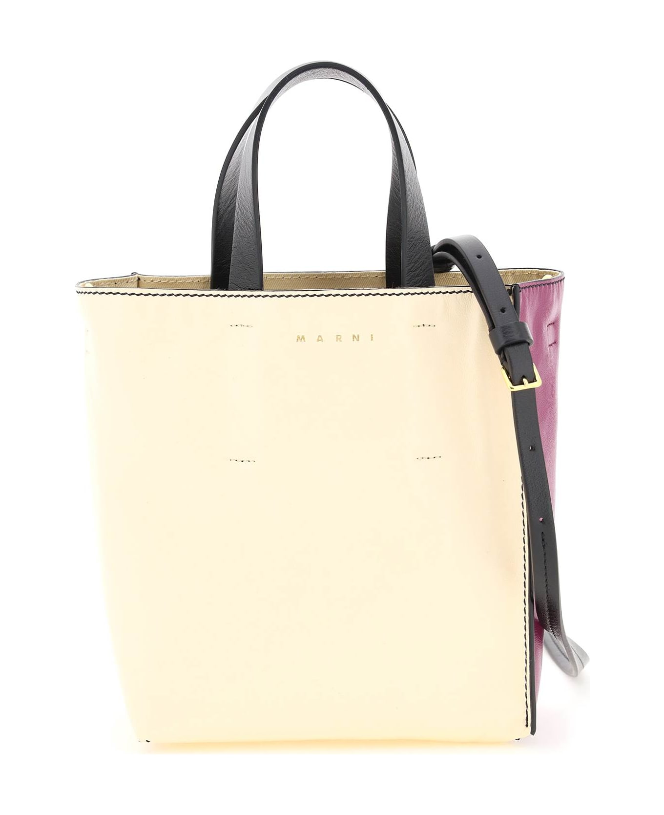 Museo Soft mini bag by Marni crafted in bicolour leather with gold-tone lettering logo print on front. Double top handle and adjustable and detachable shoulder strap in contrasting leather. Cotton lining, one inner leather patch pocket with zip closure. Gold-finished metalware. Composition: 100% pelle bovina