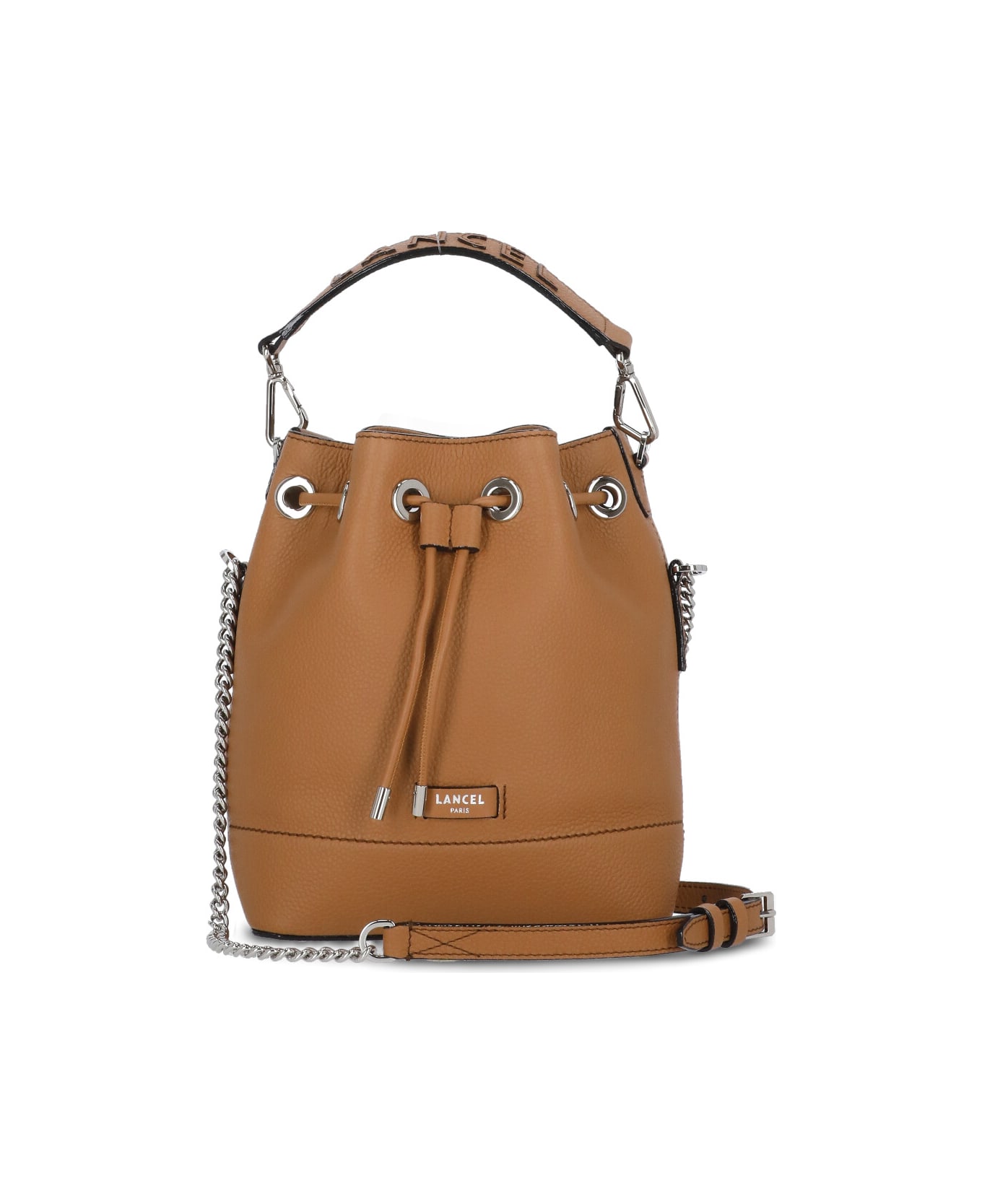 Ninon De Lancel Bucket Bag from Lancel: - Pebbled leather bucket bag - Front contrasting color logo - Removable handle with raised logo - Leather and braided metal chain shoulder strap - Drawstring and reinforced metal eyelets - One interior compartment with zip pocket and slit pocket - Metal details at hem
