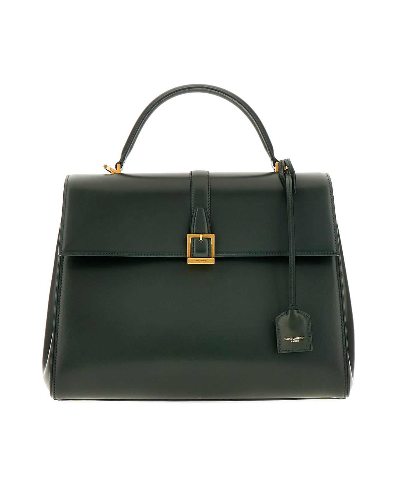 Handbag realized in smooth leather enriched by logoed metal detail at the front. -Tonal leather flat handle -Adjustable detachable tonal leather shoulder strap -Magnetic button closure -Lined interior with a patch pocket -Protective metal feet at the base Composition: Exterior: 100% Calf Lining: 100% Leather Finishing: Antiqued golden metal