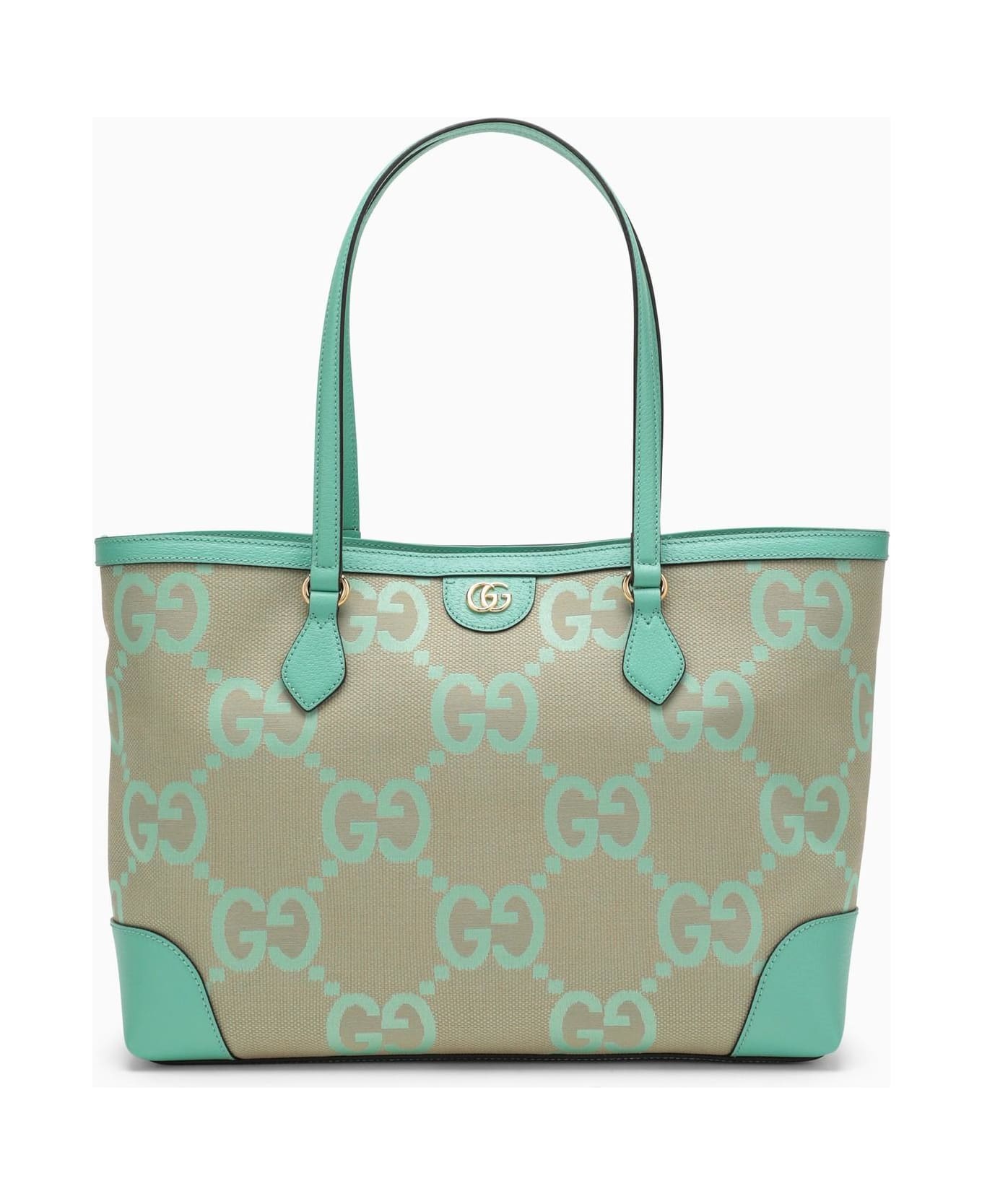 Beige coated canvas shopping bag from Gucci featuring mint leather trim, two top handles, metallic GG logo on the front, interior zip pocket, canvas lining and gold-tone metal hardware.