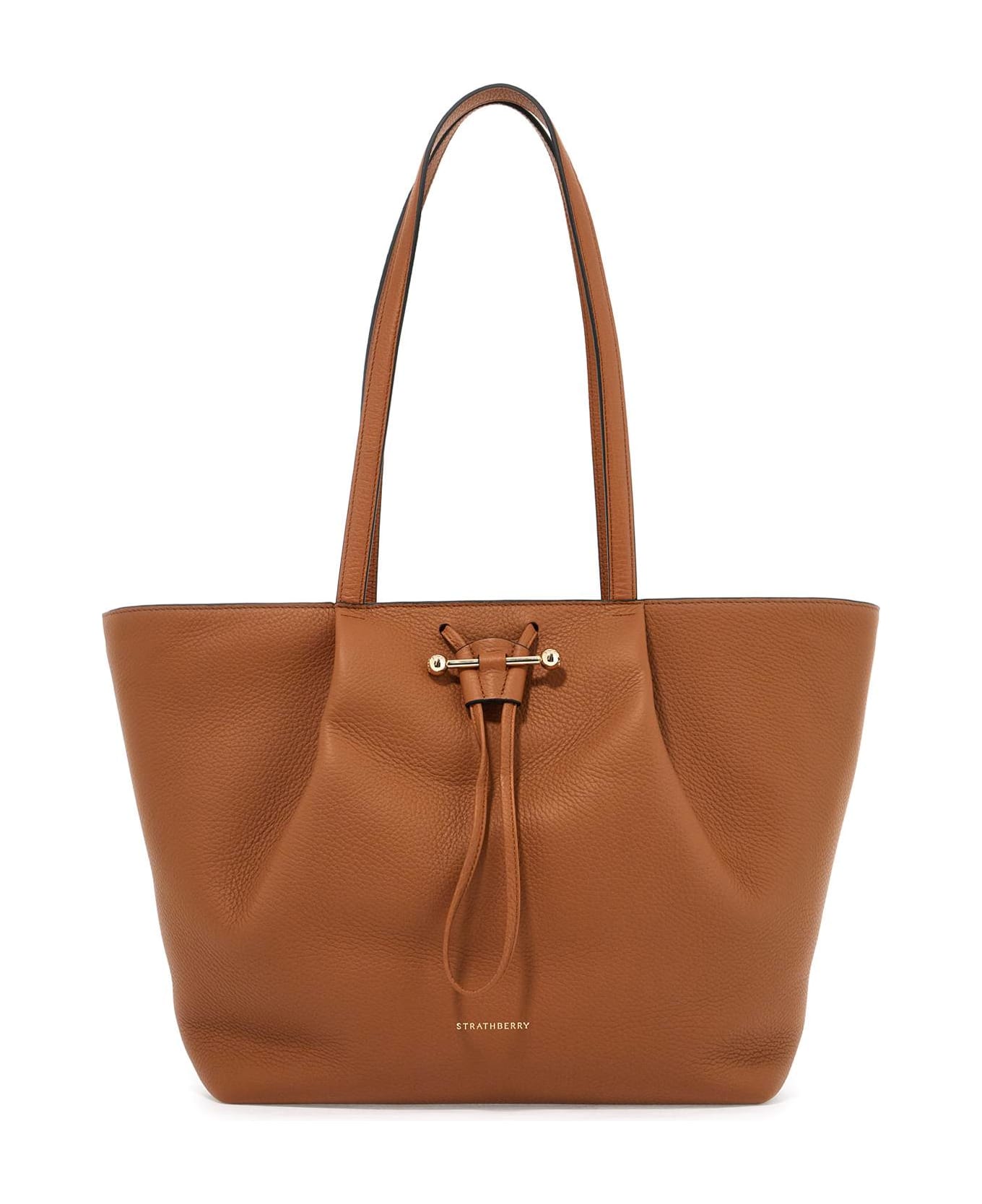 The Osette tote bag by Strathberry is made of hammered leather with a drawstring detail embellished with a classic gold Music Bar. It features a zip closure and a suede microfiber interior with an open pocket.