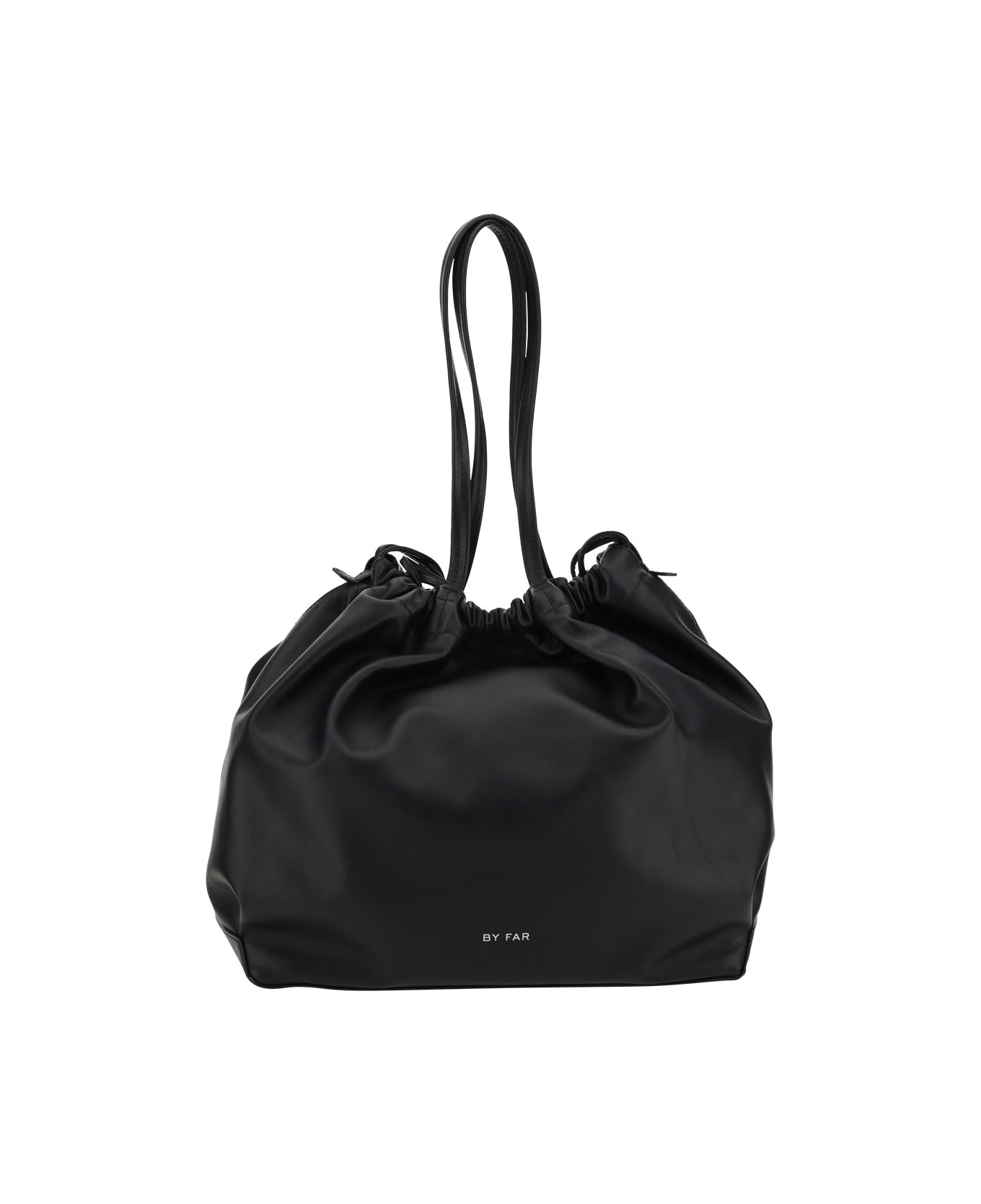 Calfskin oslo shoulder bag by by far, double flat top handle, top drawstring closure, iconic brand monogram printed in contrasting pressure on the front.